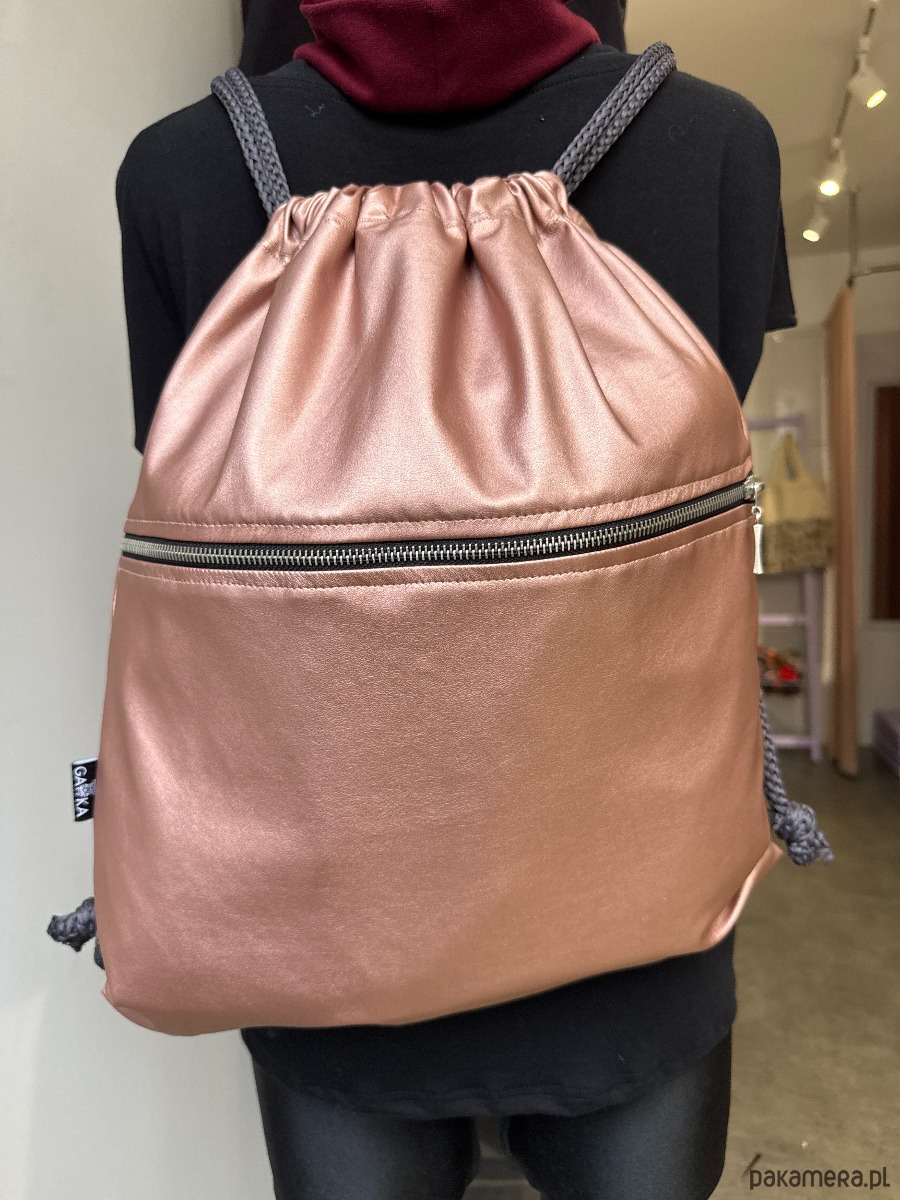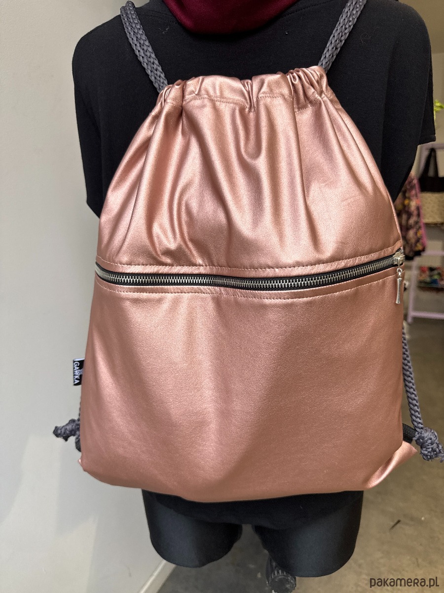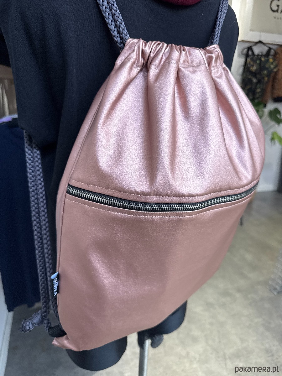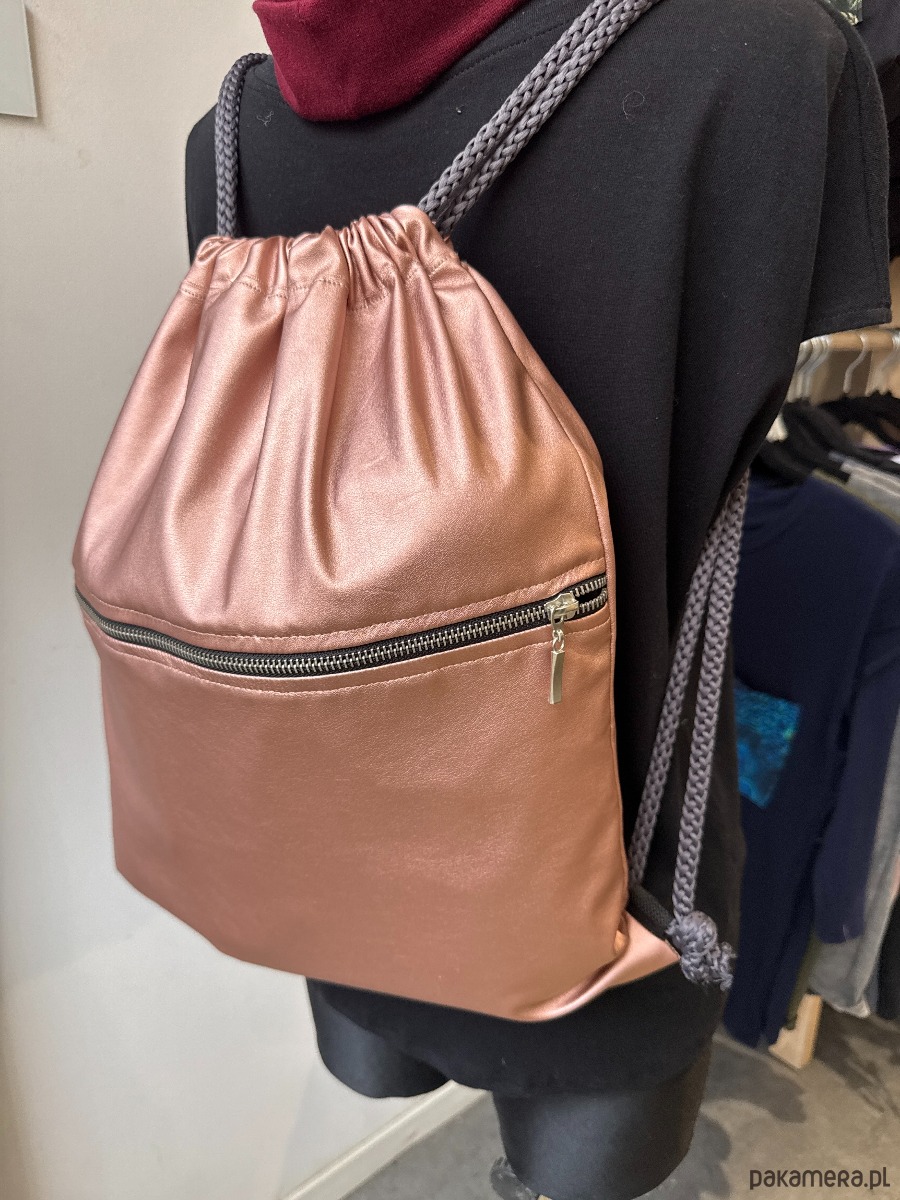 Worek z pudrowej, metalicznej ekoskóry. Elegancki albo miejski w zależności od stroju i okazji.