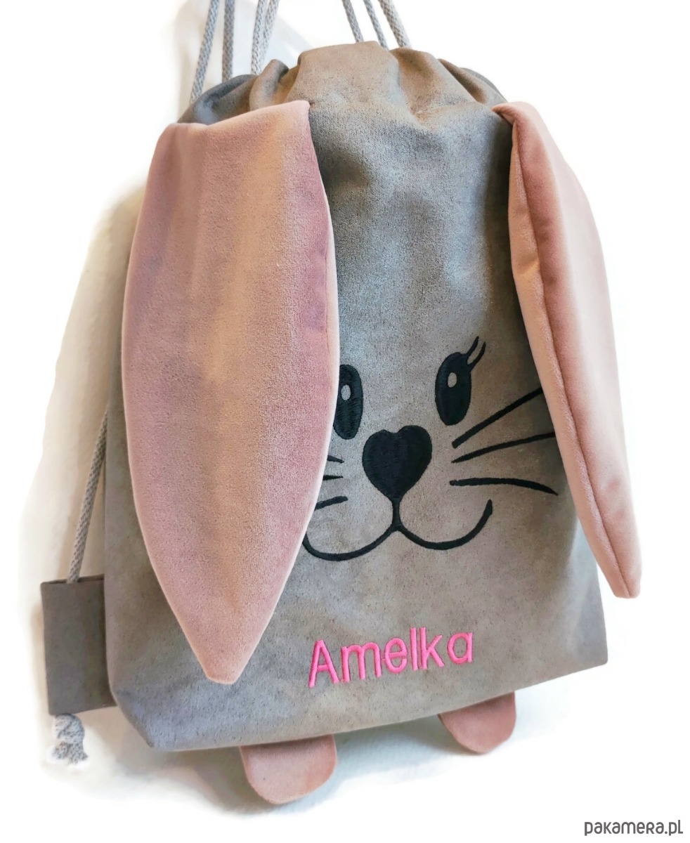 Worek szary dla przedszkolaka z imieniem zajączek uszy