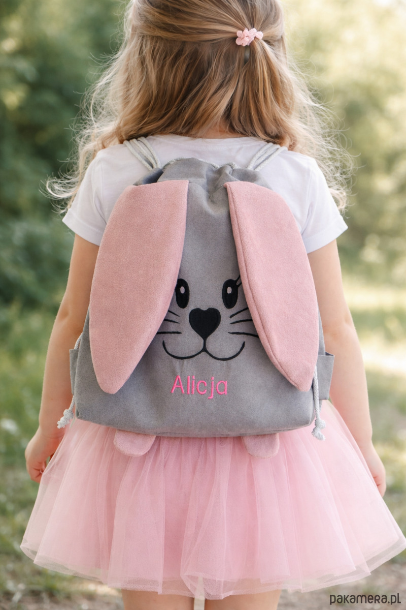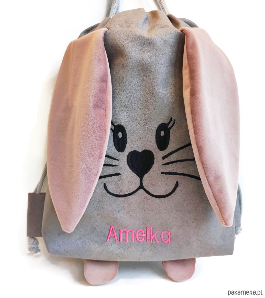 Worek szary dla przedszkolaka z imieniem zajączek uszy