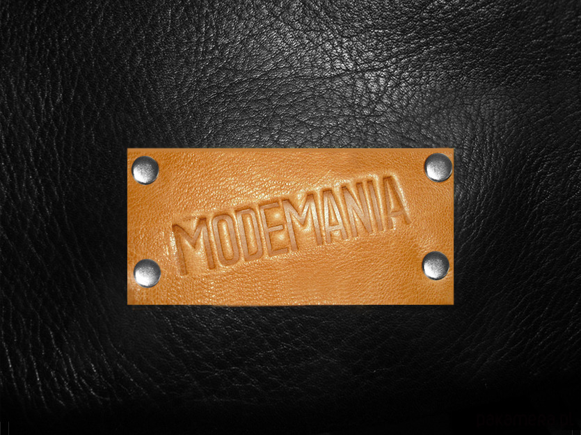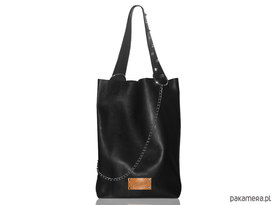 Na froncie metalowy łańcuch i skórzana metka przybita nitami.