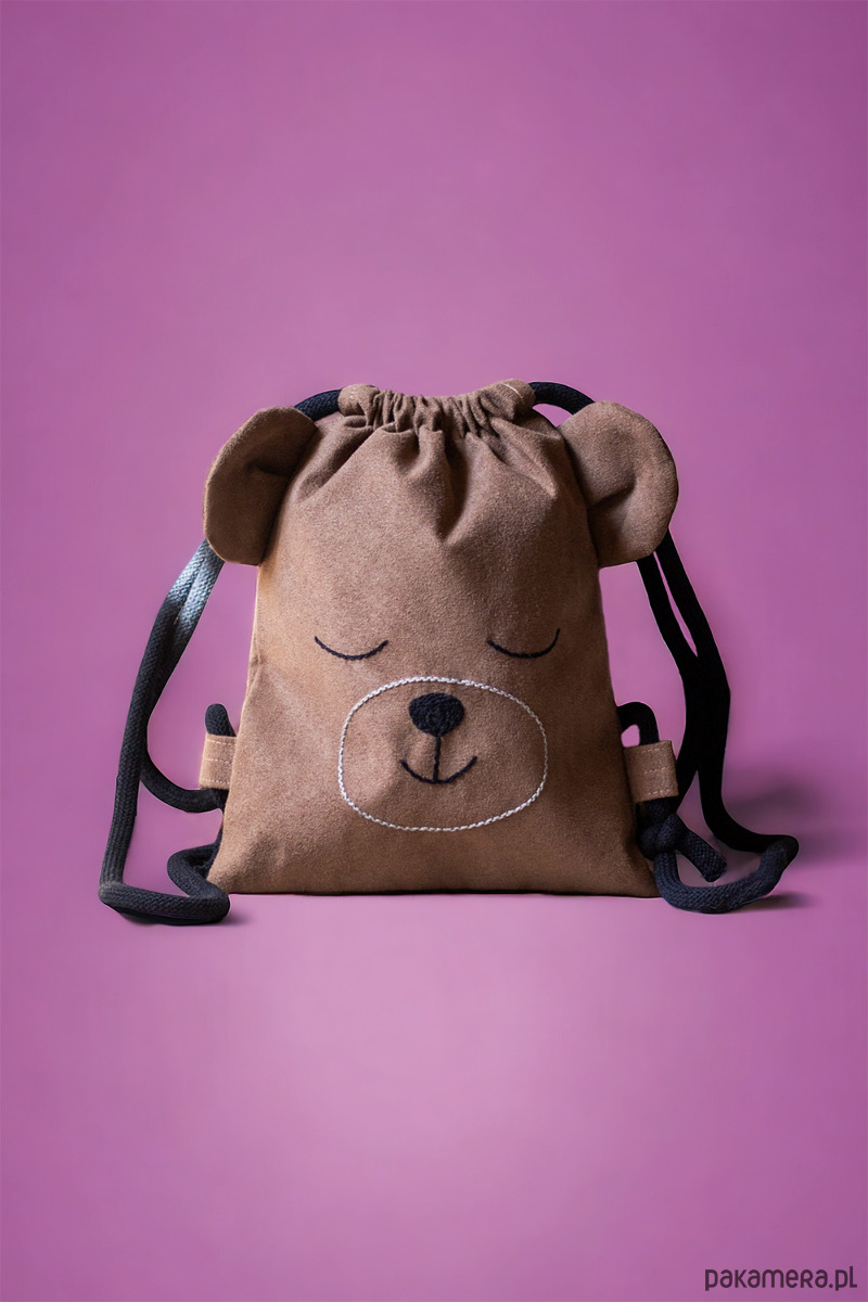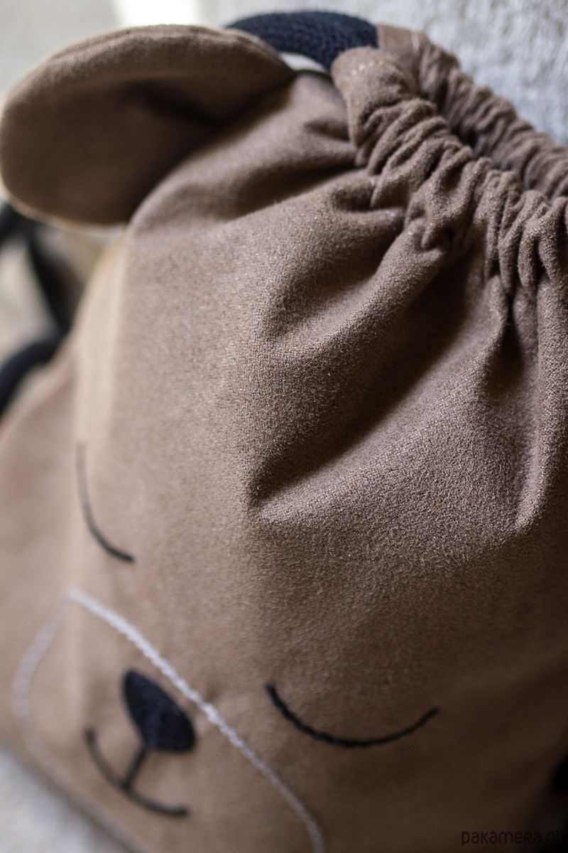 Dziecięcy plecaczek worek wykonany z brązowego nubuku. Ręcznie haftowany pyszczek misia. Bawełniane sznurki w kolorze czarnym.