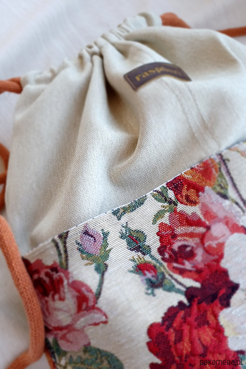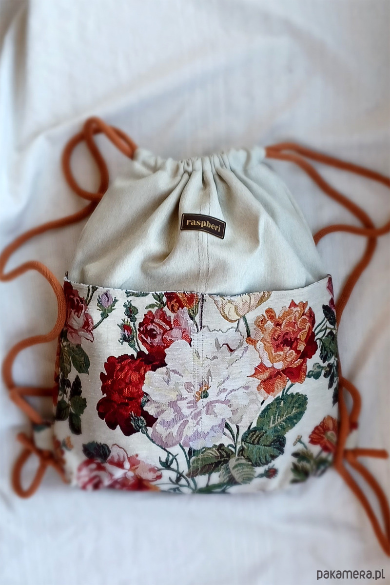 Workoplecak z weluru w kolorze ecru z kieszeniami z żakardu w kwiaty.