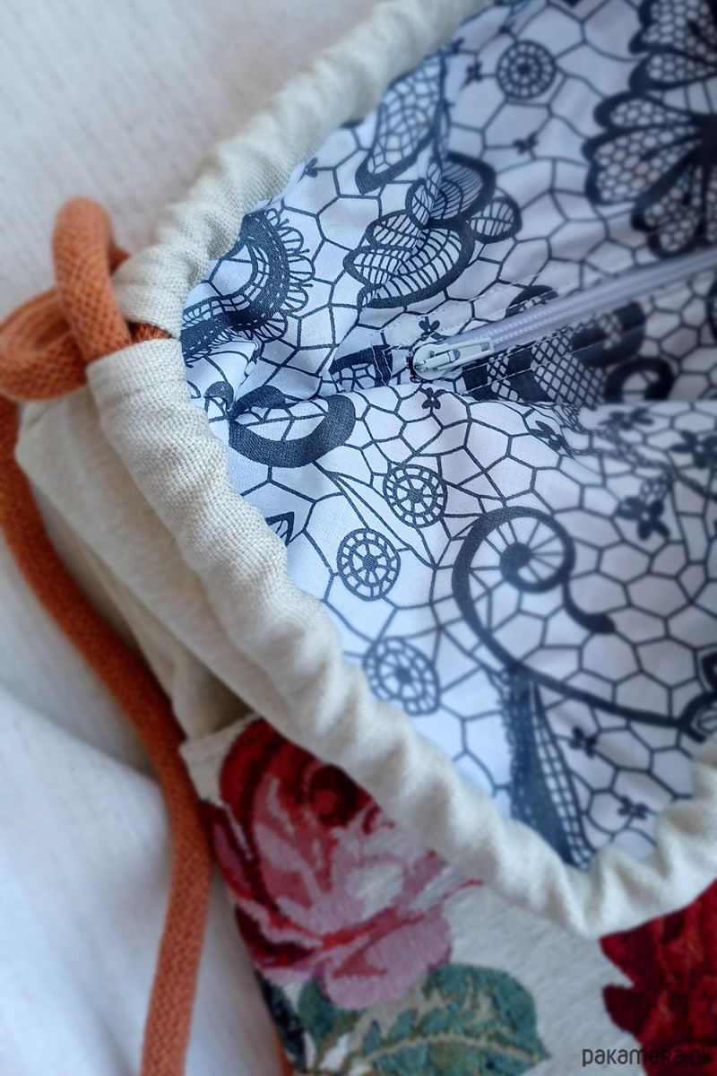 W środku plecak posiada kieszeń zapinaną na suwak oraz wzorzystą, bawełnianą podszewkę.