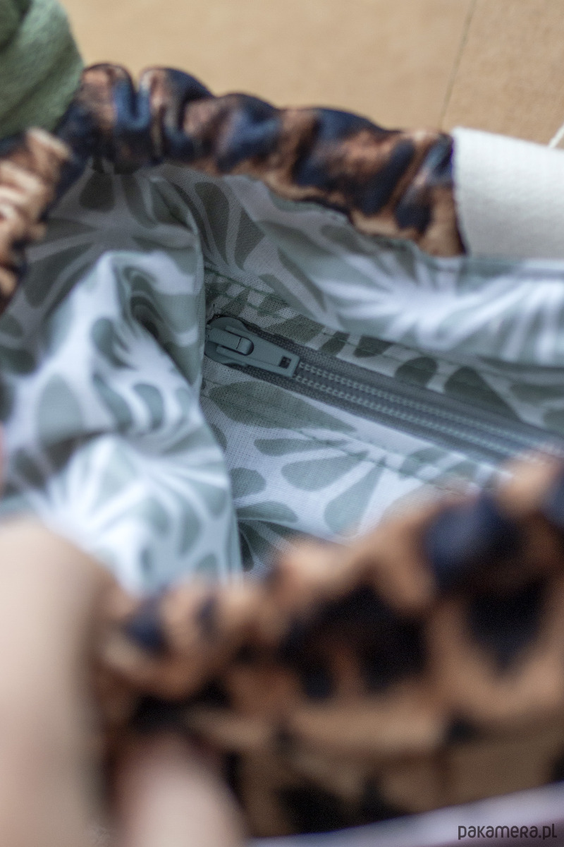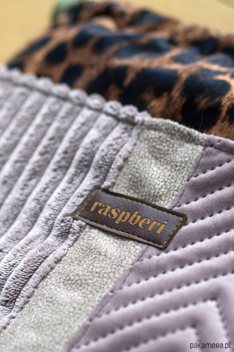 Wykonany z weluru w panterkę. Z przodu oraz z na tyle torebki kieszenie (np. na telefon czy chusteczki) z pudroworóżowego sztruksu oraz beżowego i różowego weluru.