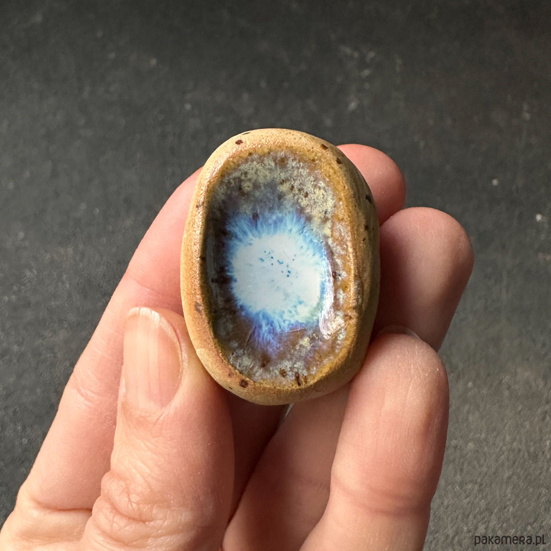 Każdy z nich jest unikatowy. Ten egzemplarz jest poszkliwiony niebieskim szkliwem. Wokoło surowa, naturalna glina w kropki.