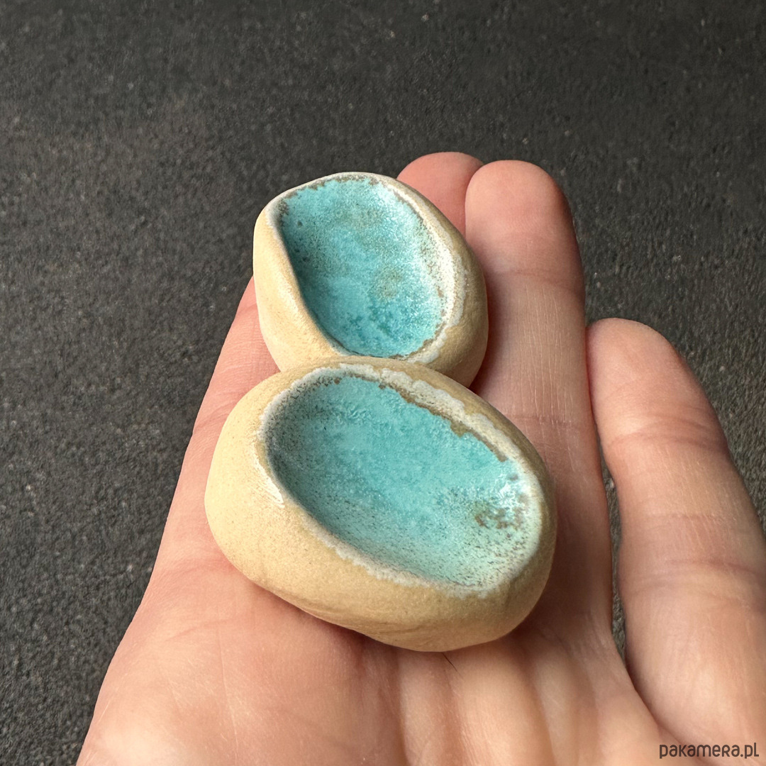 Każdy z nich jest unikatowy. Ten egzemplarz jest poszkliwiony turkusowym szkliwem. Wokoło surowa, naturalna glina w jasnym kolorze.