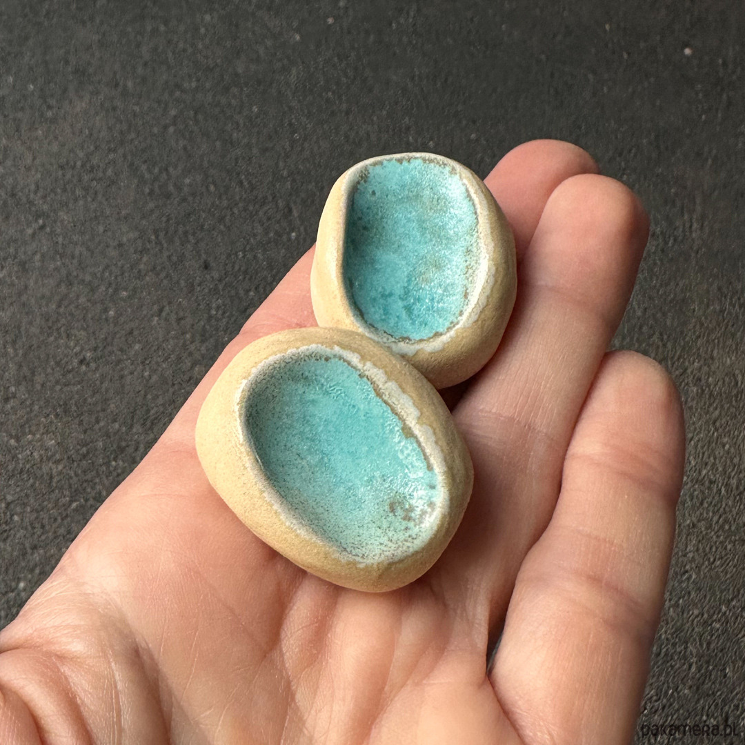 Każdy z nich jest unikatowy. Ten egzemplarz jest poszkliwiony turkusowym szkliwem. Wokoło surowa, naturalna glina w jasnym kolorze.