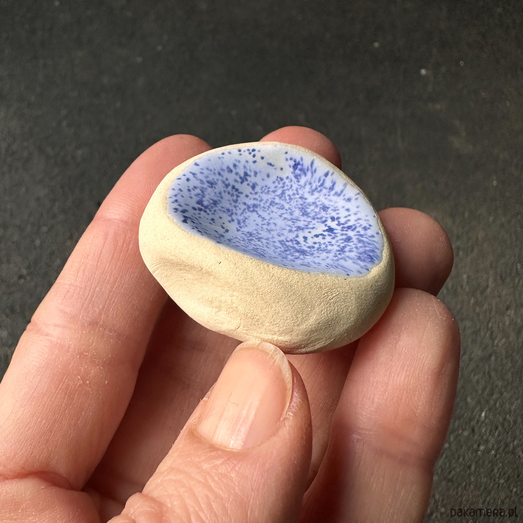 Każdy z nich jest unikatowy. Ten egzemplarz jest poszkliwiony niebieskim nakrapianym szkliwem. Wokoło surowa, naturalna glina w jasnym kolorze.