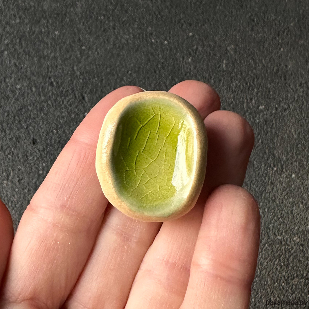 Każdy z nich jest unikatowy. Ten egzemplarz jest poszkliwiony szkliwem jasnozielonym z efektem popękanego szkła (krakle). Wokoło surowa, naturalna glina w jasnym kolorze.