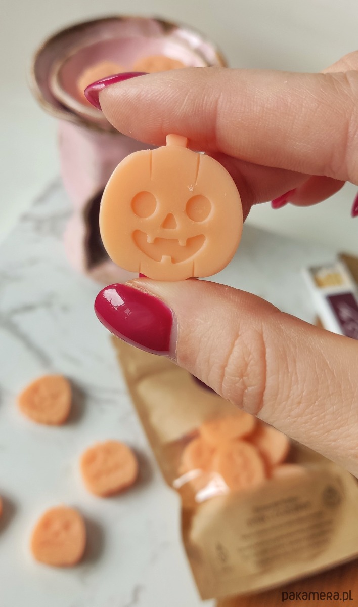 Wosk zapachowy do kominka w kształcie hallowynowych dyń w kolorze pomarańczowym.