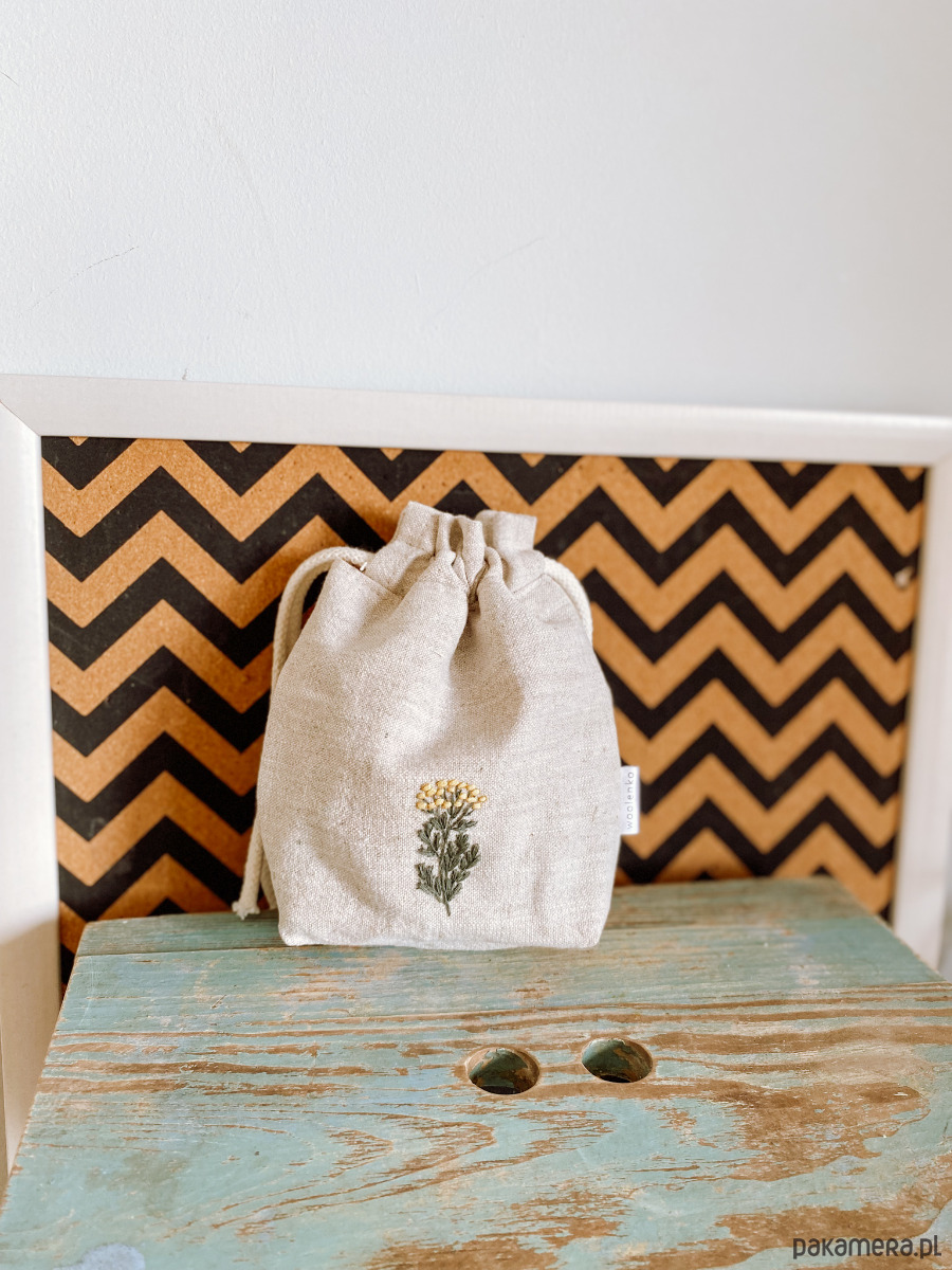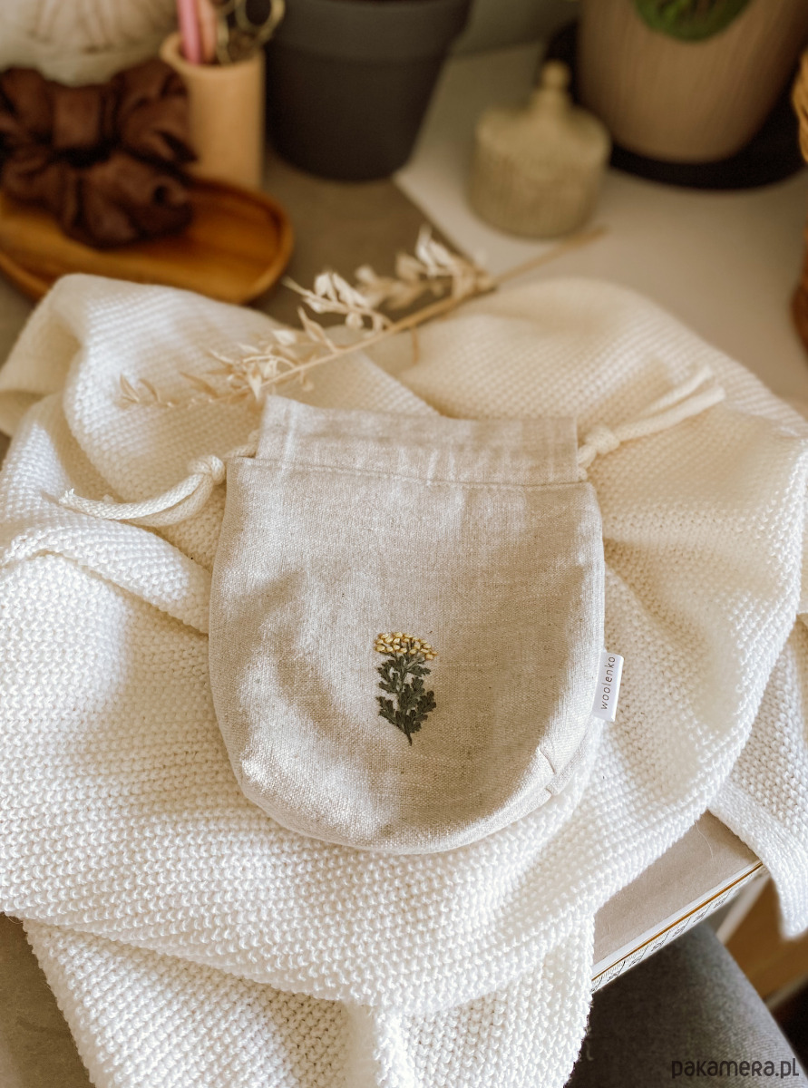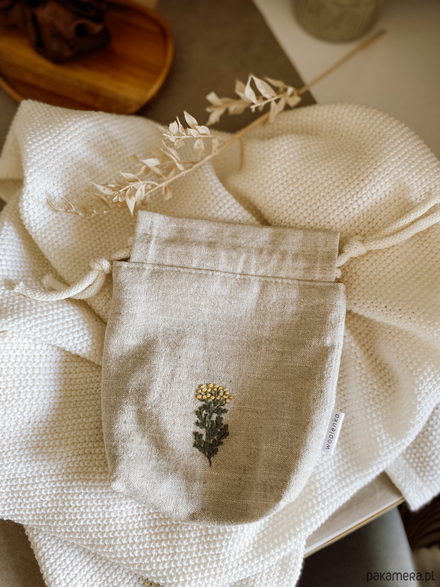 Woreczki to nieocenione organizery w torebce czy plecaku. Sprawdzą się jako etui na zakupach, spacerze czy podczas wycieczki. Wykonane w 100% z lnianej tkaniny zapewniają komfort używania oraz wytrzymałość.