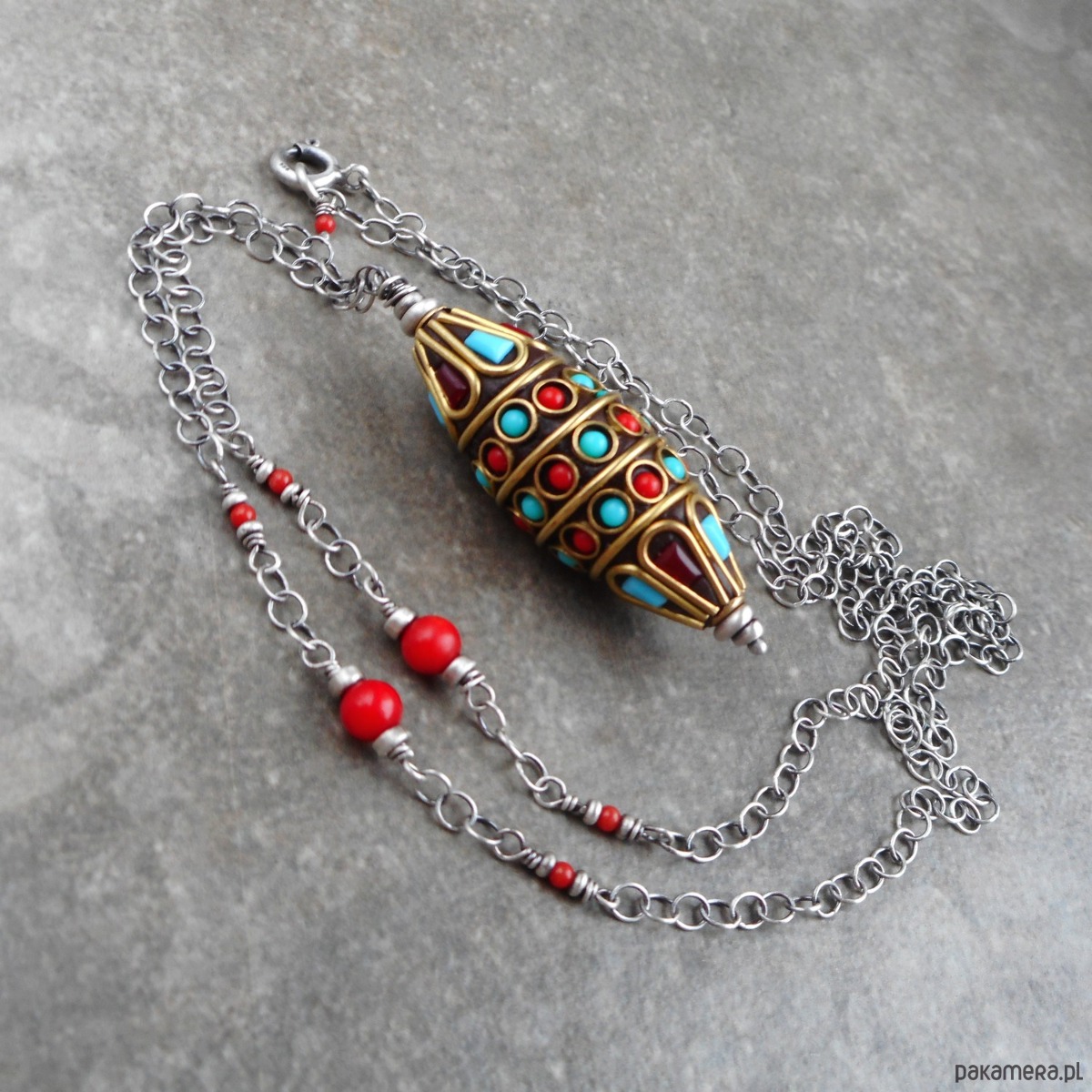 Dłuższy naszyjnik wykonany ze szlachetnego srebra i kamieni naturalnych; główną ozdobą naszyjnika jest koralik tybetański - mosiężne wrzeciono ( 40 mm) zdobione koralem i turkusem.