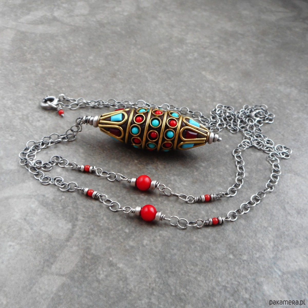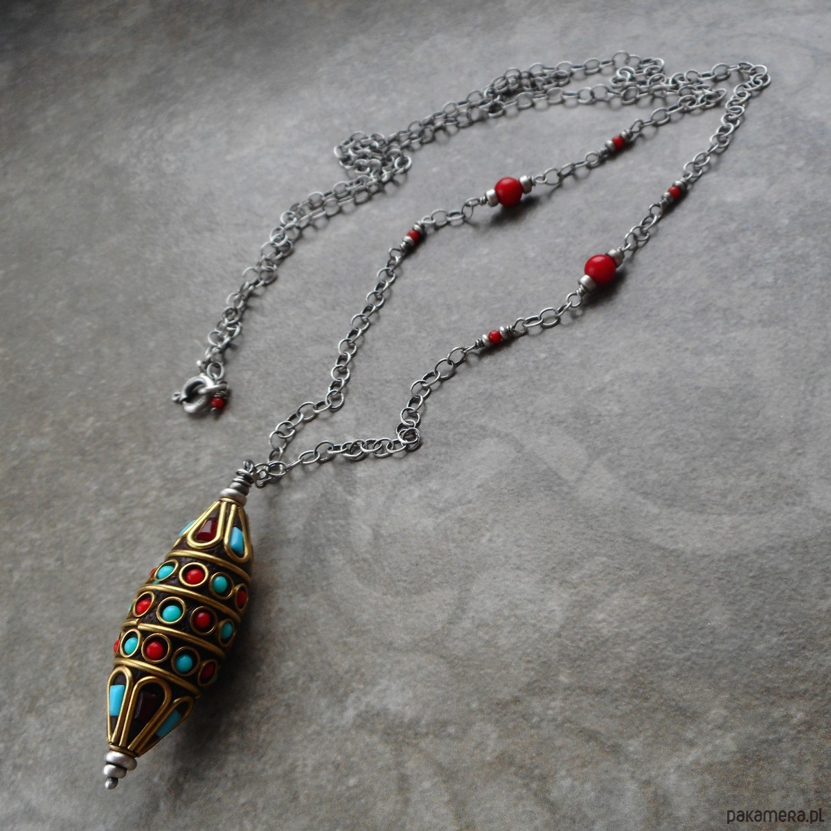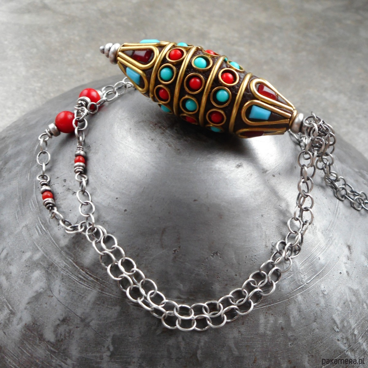 Dłuższy naszyjnik wykonany ze szlachetnego srebra i kamieni naturalnych; główną ozdobą naszyjnika jest koralik tybetański - mosiężne wrzeciono ( 40 mm) zdobione koralem i turkusem.