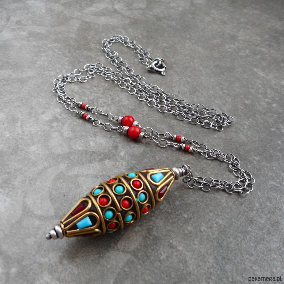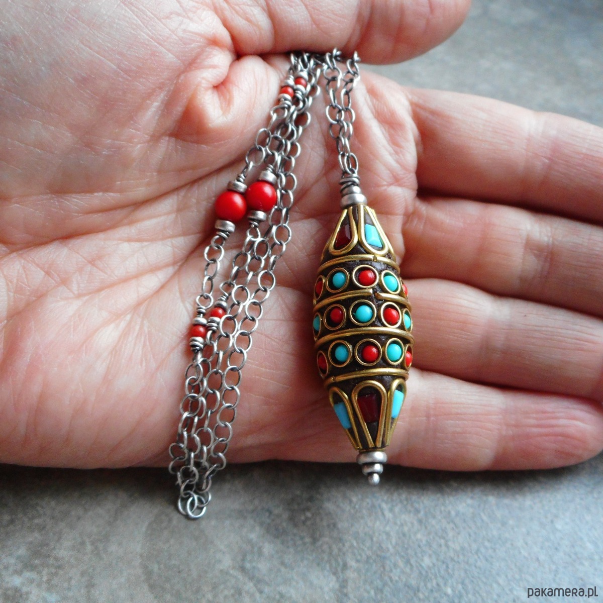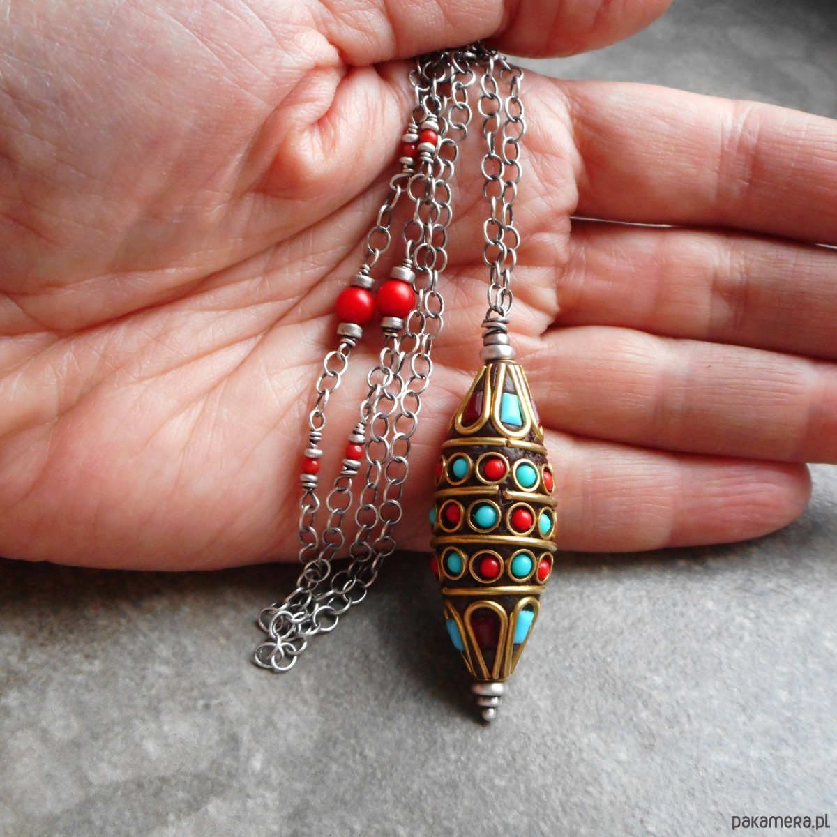 Dłuższy naszyjnik wykonany ze szlachetnego srebra i kamieni naturalnych; główną ozdobą naszyjnika jest koralik tybetański - mosiężne wrzeciono ( 40 mm) zdobione koralem i turkusem.