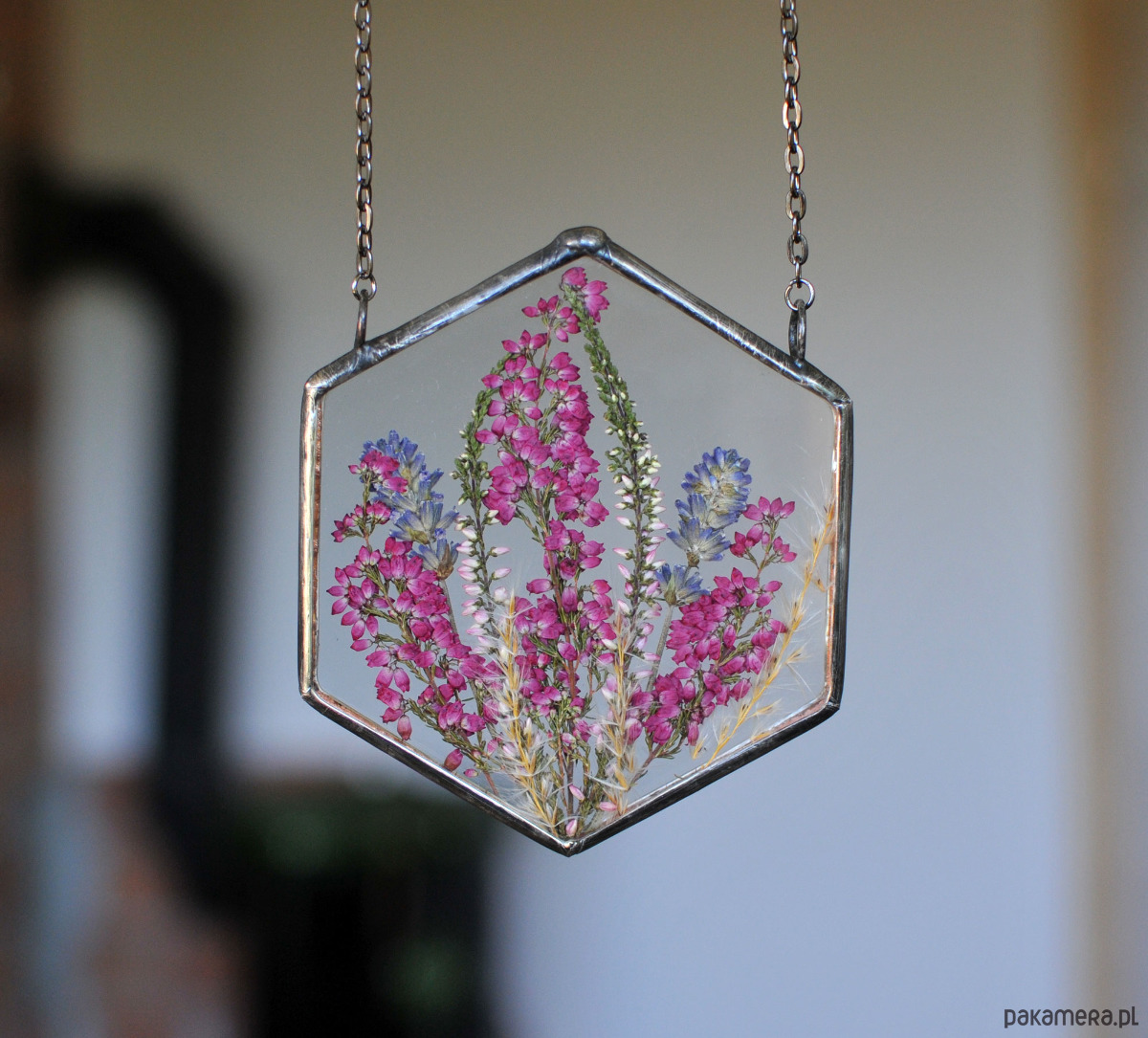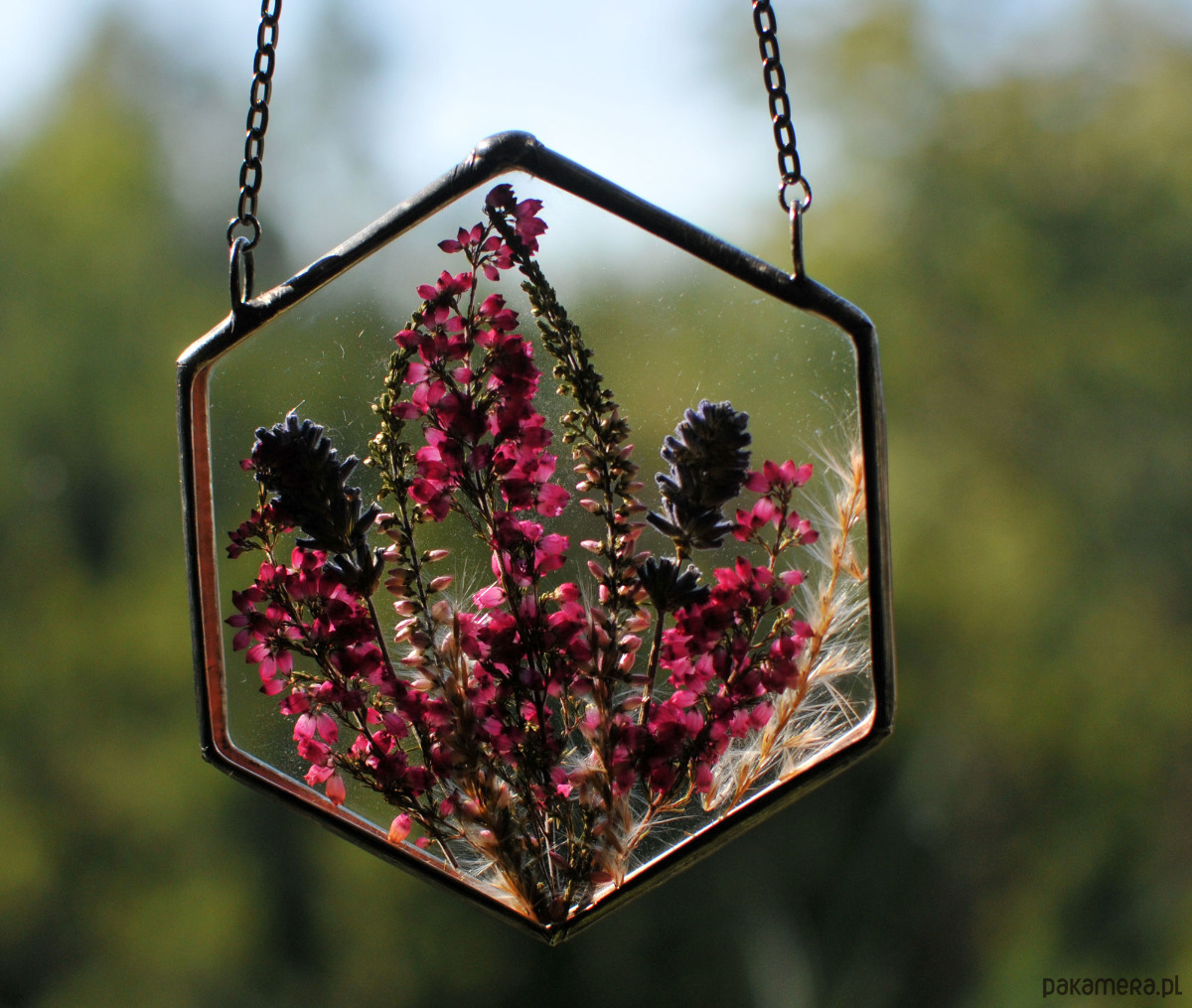 W sześciokątnym szkle umieszczone są prawdziwe, suszone kwiaty w kolorze fioletu, m.in. lawenda i wrzos.