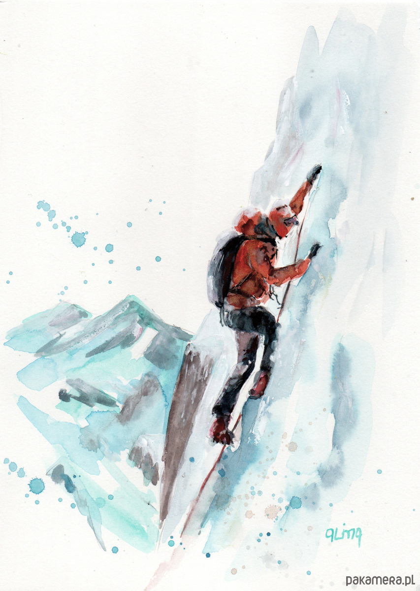 Wspinaczka, zima, góry. Akwarela ręcznie malowana