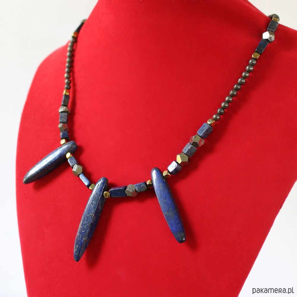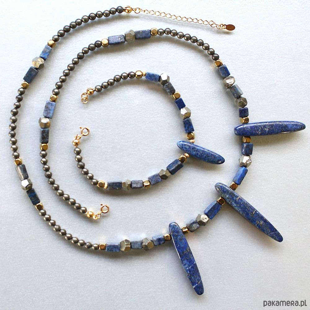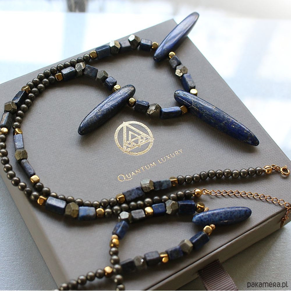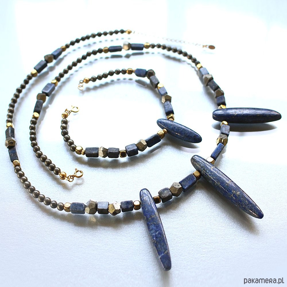 Unikatowy energetyczny naszyjnik z bransoletką w komplecie, z lapis lazuli, fasetowanym pirytem i hematytem pozłacanym 24k złotem.