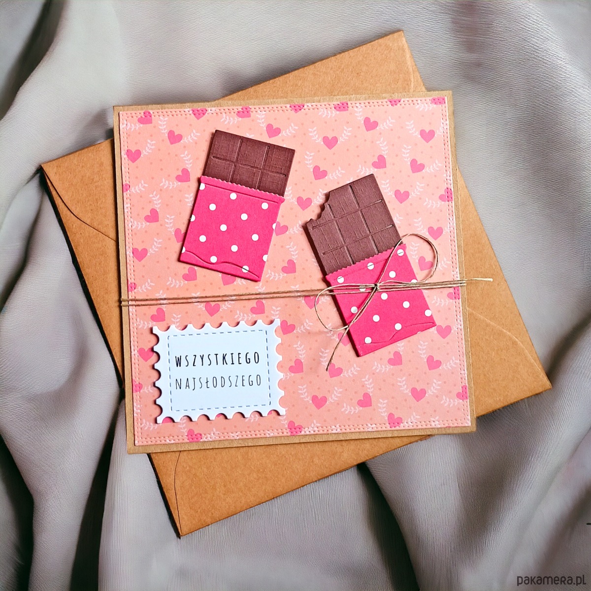 wykonana na bazie grubego kartonu EKO-kraft (100% makulatury), ozdobiona wzorzystym papierem. Starannie dobrane dodatki: przestrzenne czekoladki wykonane własnoręcznie z warstwowo ułożonych elementów, drukowany napis. przewiązana sznurkiem jutowym.
