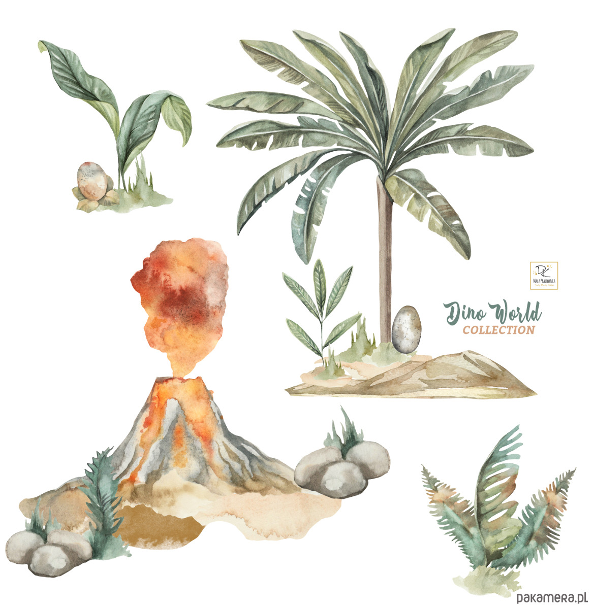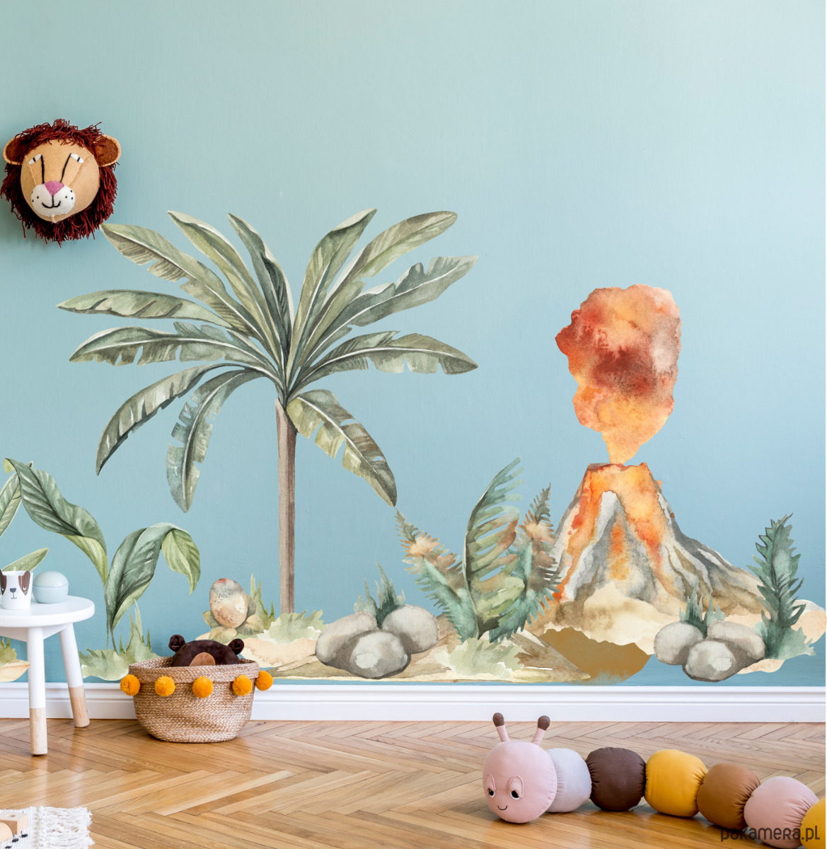 Naklejka ścienna z wulkanem, palmą i roślinami prehistorycznymi z kolekcji Dino World. Przeznaczona do dekoracji pokoju dziecka oraz tworzenia aranżacji z motywem dinozaurów.
