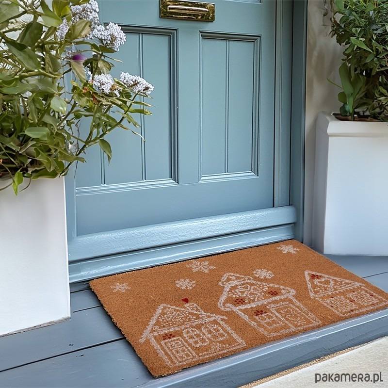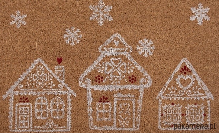 Wycieraczka wykonana naturalnego włókna kokosowego. Przedstawia motyw piernikowych domków. Podkład PVC.