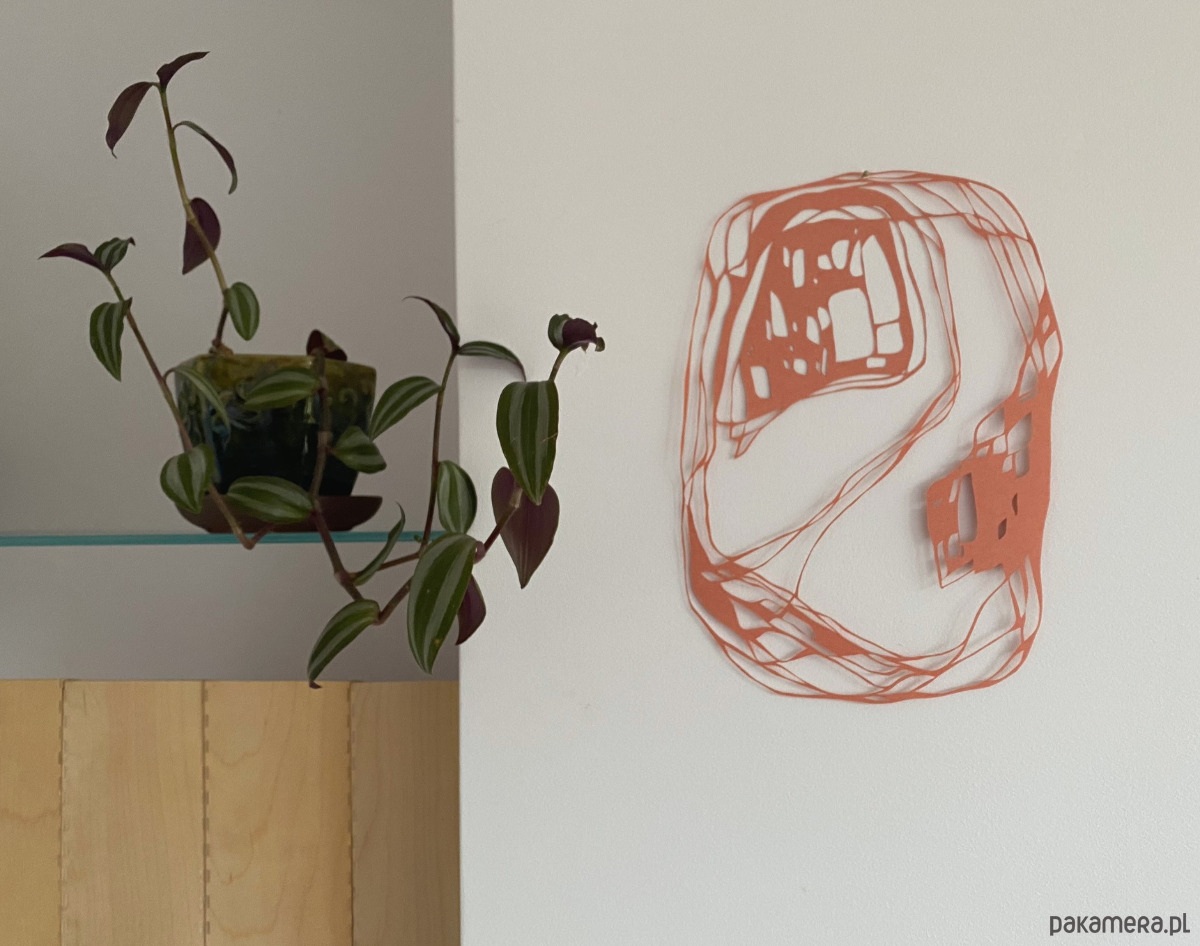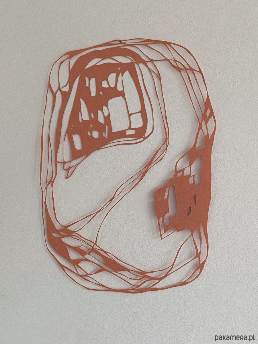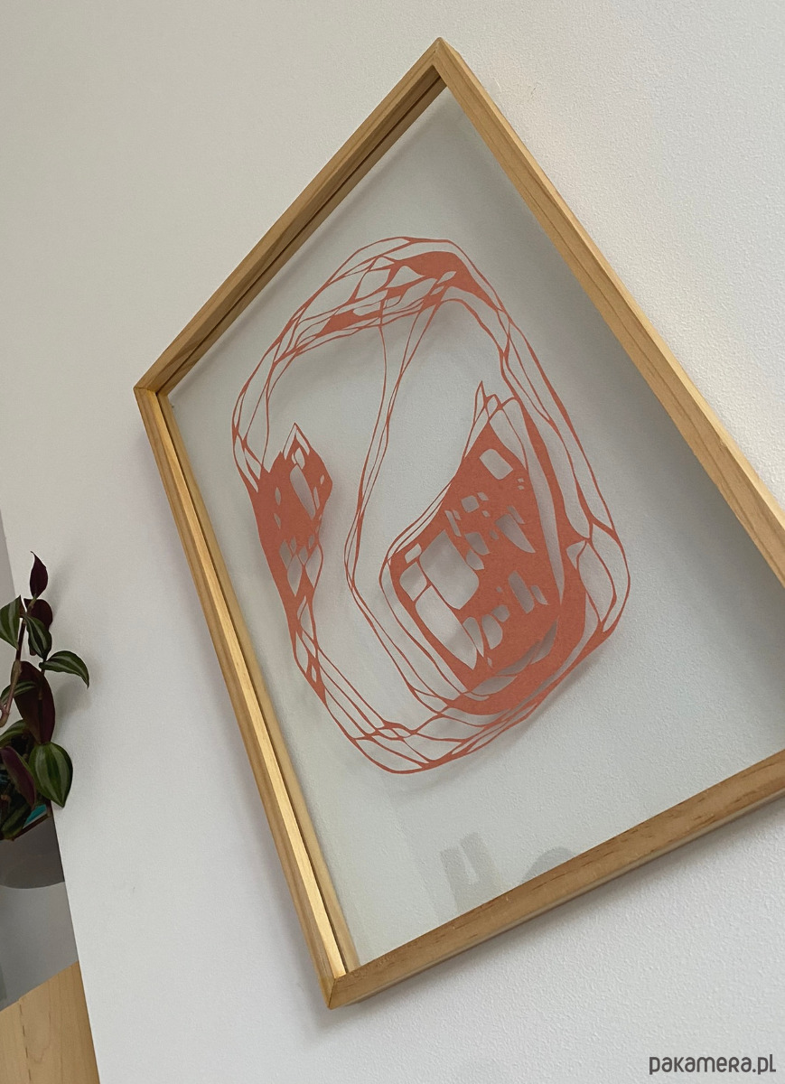Jest to ręcznie wycinana skalpelem praca, stworzona na bazie bardzo ogólnego szkicu. Podczas pracy lubię odchodzić od pierwotnego rysunku i wycinać swobodnie, bez trzymania się początkowego planu – ta wolność daje mi energię i sprawia, że mogę z przyjemnością poświęcić wiele godzin na misterne wycinanie detali.