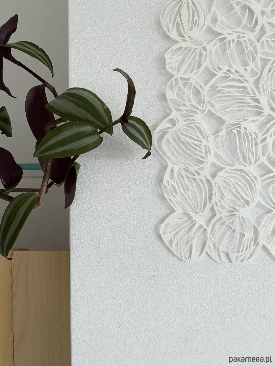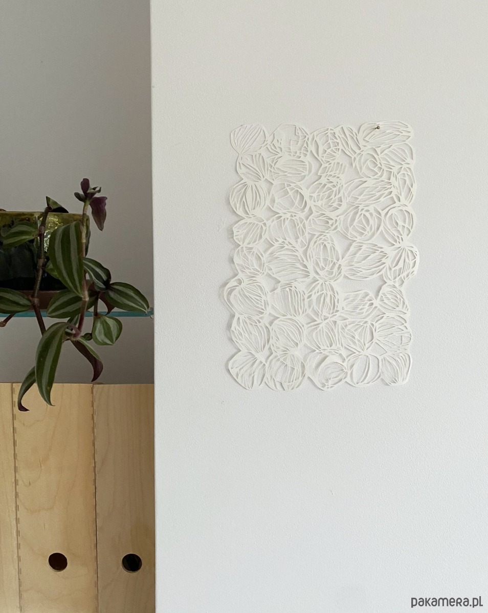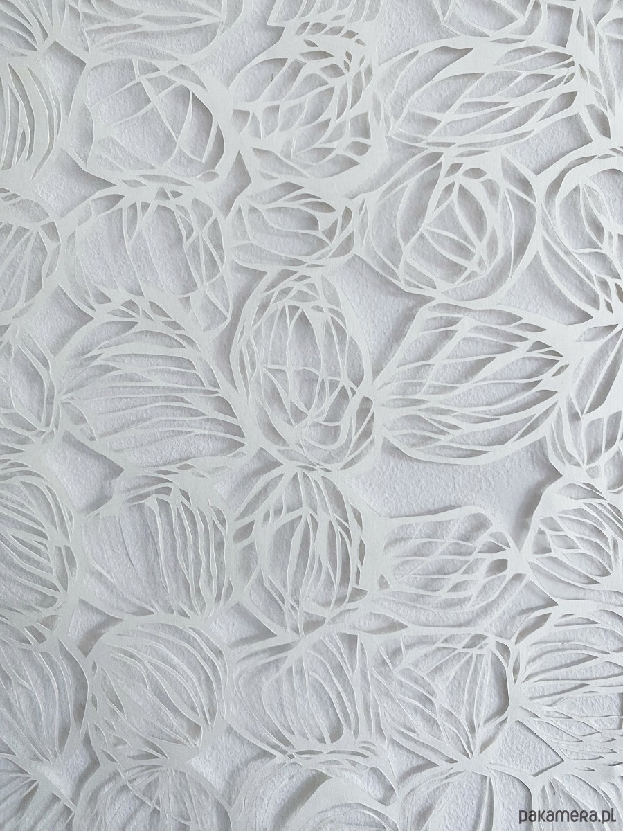 Jest to ręcznie wycinana skalpelem praca, stworzona na bazie bardzo ogólnego szkicu. Podczas pracy lubię odchodzić od pierwotnego rysunku i wycinać swobodnie, bez trzymania się początkowego planu – ta wolność daje mi energię i sprawia, że mogę z przyjemnością poświęcić wiele godzin na misterne wycinanie detali.