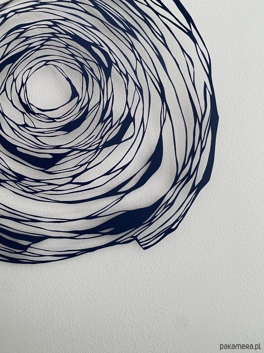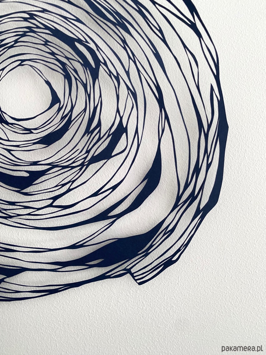 Abstrakcyjna, okrągła, ręcznie wykonana wycinanka z granatowego papieru. Przedstawia nieregularną spiralę, inspirowaną formami organicznymi. Doskonała jako dekoracja ścienna dla miłośników sztuki abstrakcyjnej i natury.
