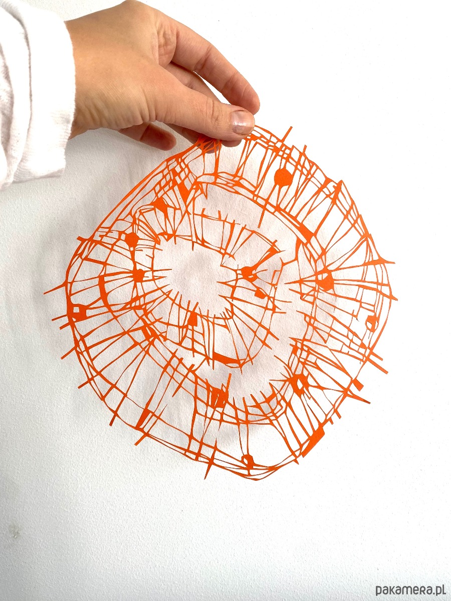 Jest to ręcznie wycinana skalpelem praca, stworzona na bazie bardzo ogólnego szkicu. Podczas pracy lubię odchodzić od pierwotnego rysunku i wycinać swobodnie, bez trzymania się początkowego planu – ta wolność daje mi energię i sprawia, że mogę z przyjemnością poświęcić wiele godzin na misterne wycinanie detali.