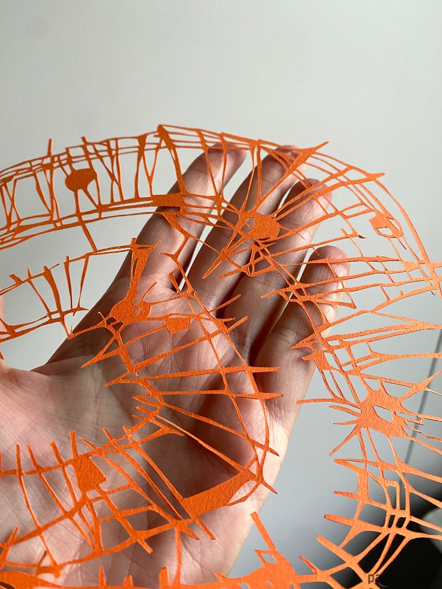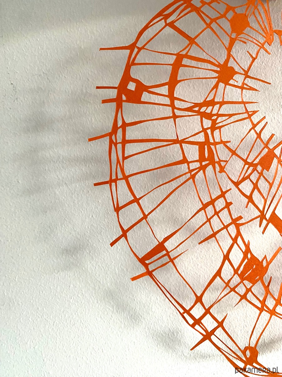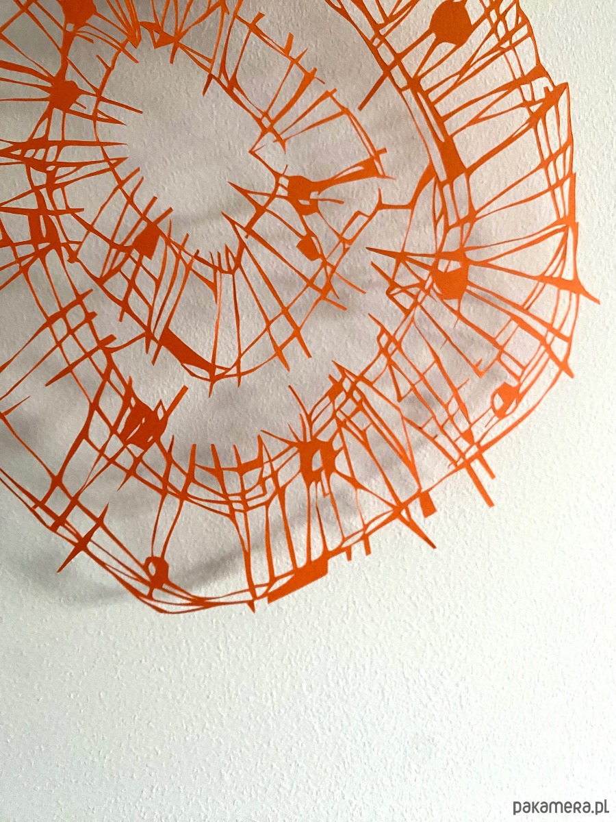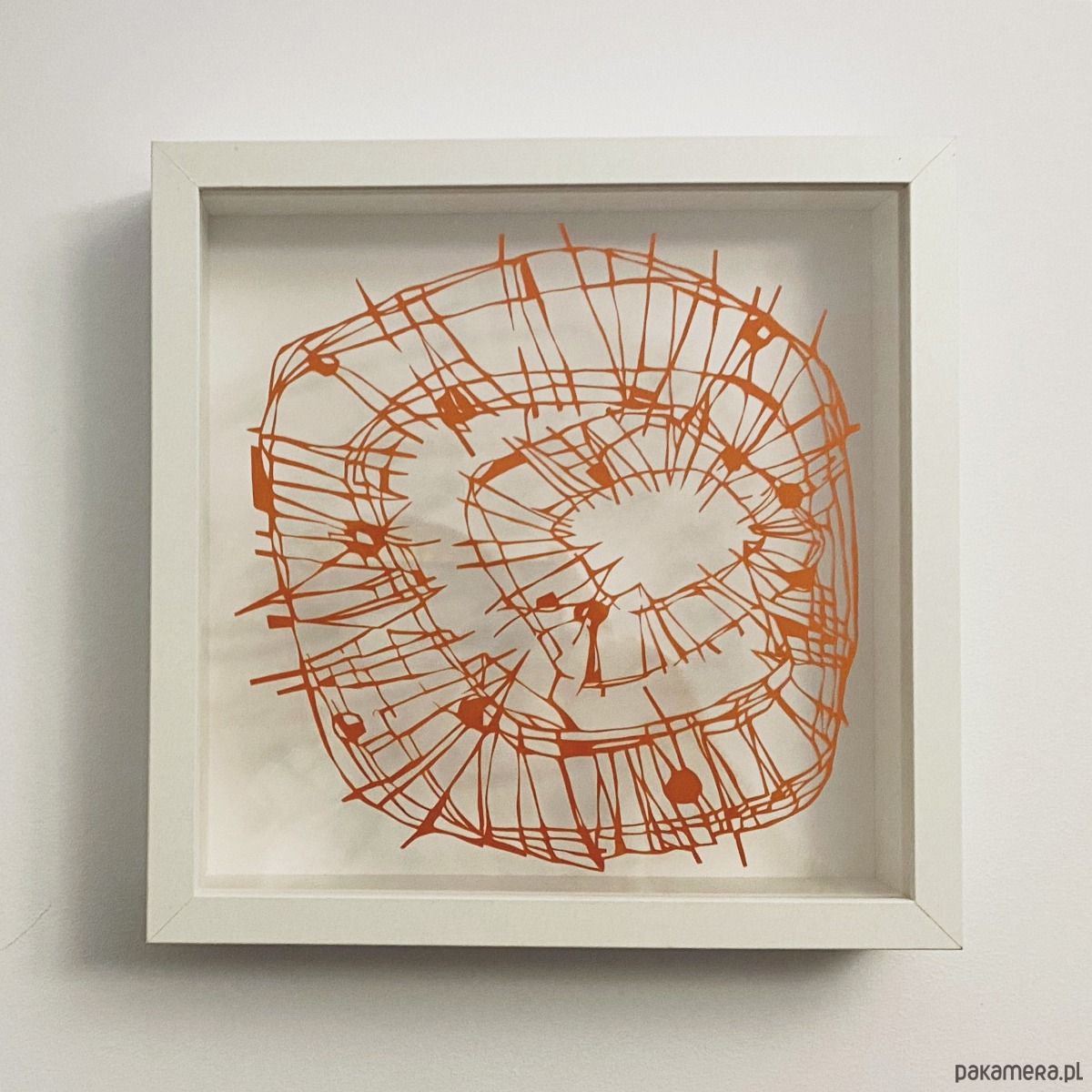 Unikatowa, delikatna, ręcznie wykonana praca z papieru, w kolorze pomarańczowym. Dynamiczna abstrakcja pełna nieregularnych linii i okręgów.