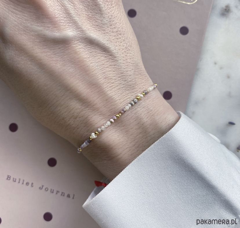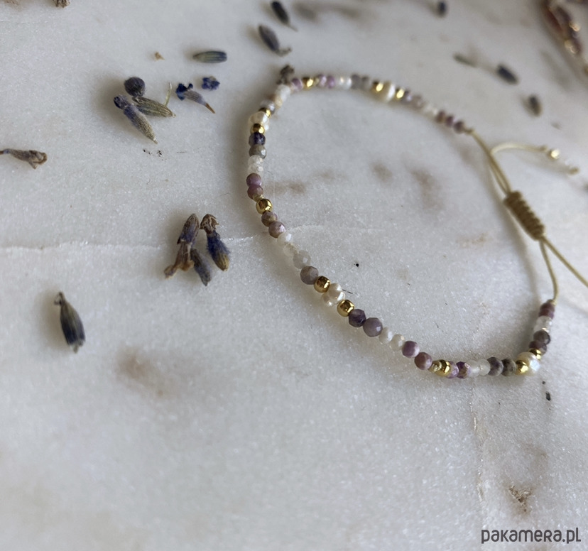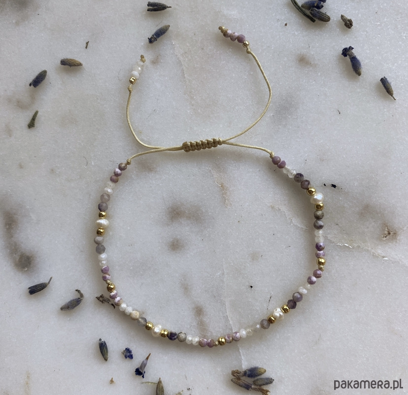 Bransoletka regulowana z makramowym zapięciem z maleńkimi Fosfosyderytami , Czaroitem, Kamieniem Księżycowym i perełkami.