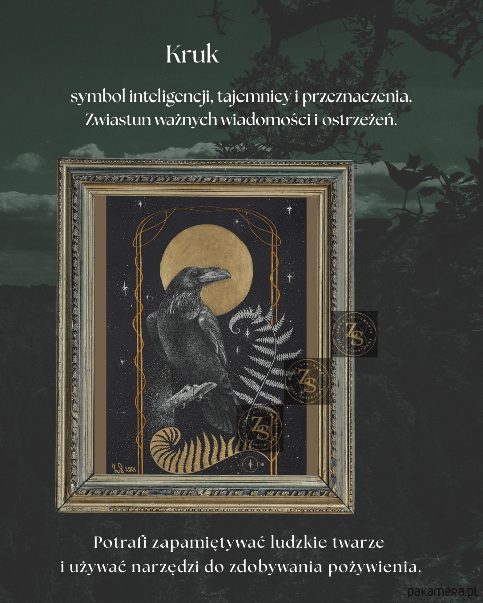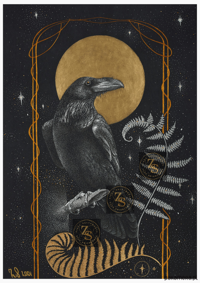 Wydruk artystyczny z wizerunkiem kruka, wykonany na wysokiej jakości, matowym papierze archiwalnym 230 gsm.