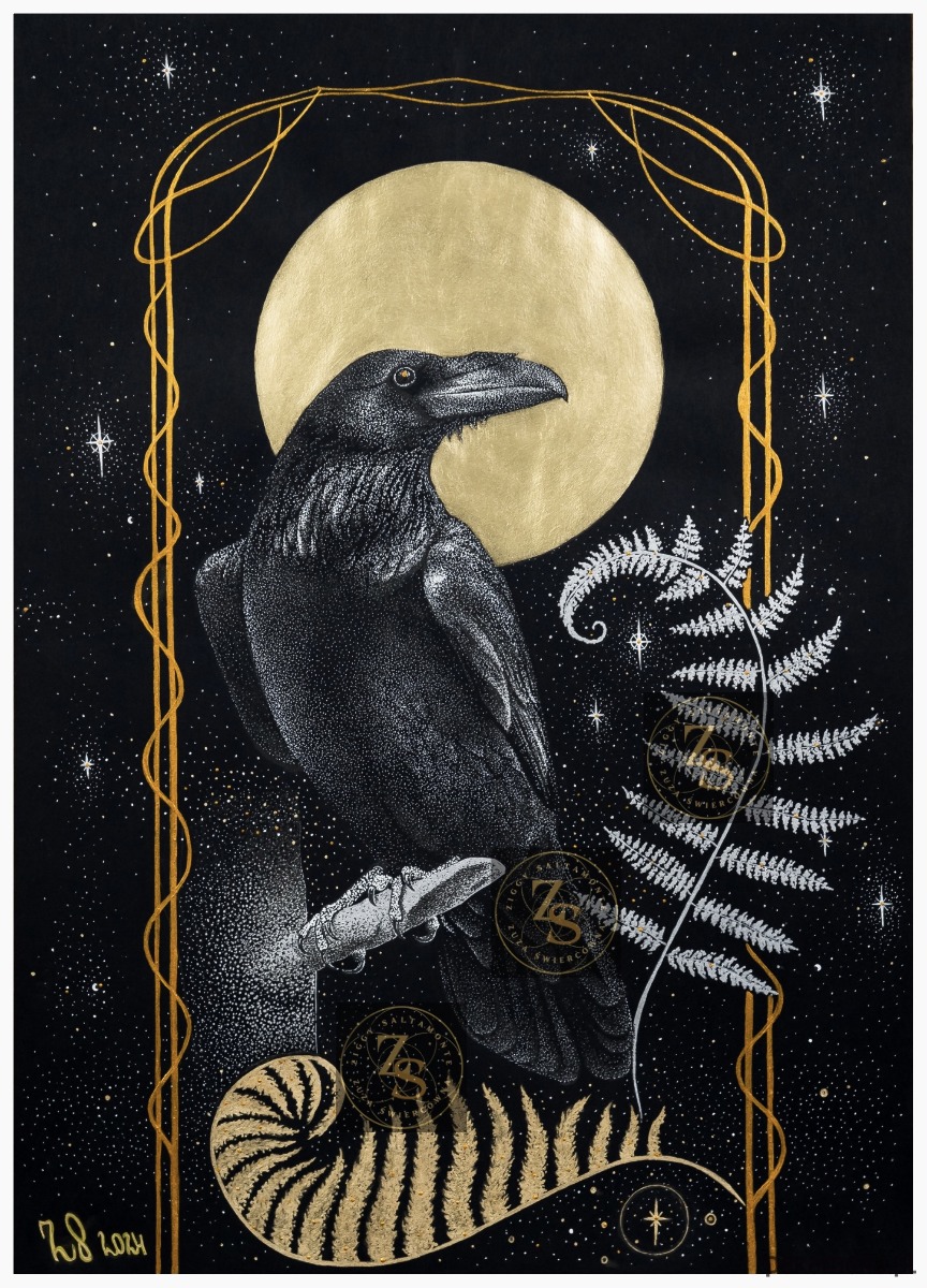 Wydruk artystyczny z wizerunkiem kruka, wykonany na wysokiej jakości, matowym papierze archiwalnym 230 gsm.