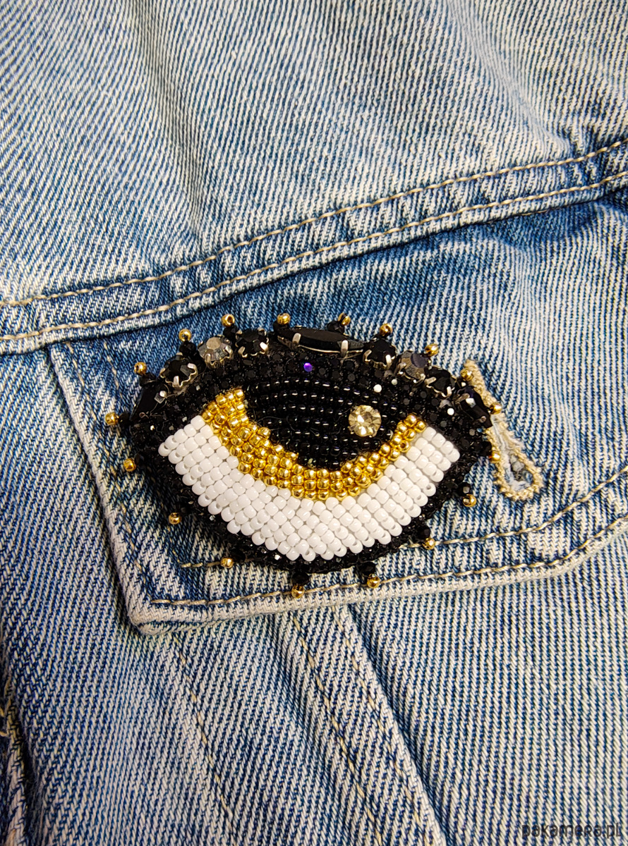Zjawiskowa broszka z motywem oka w sercu. Wykonana z kilku rodzajów koralików oraz kryształków.