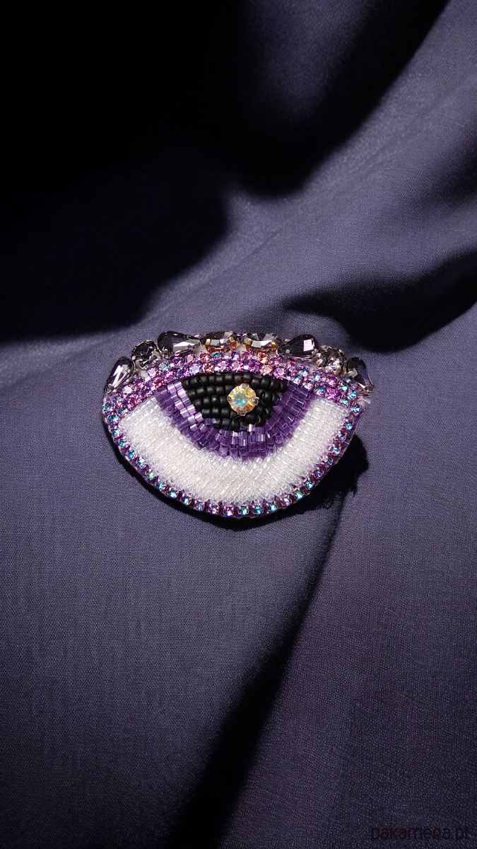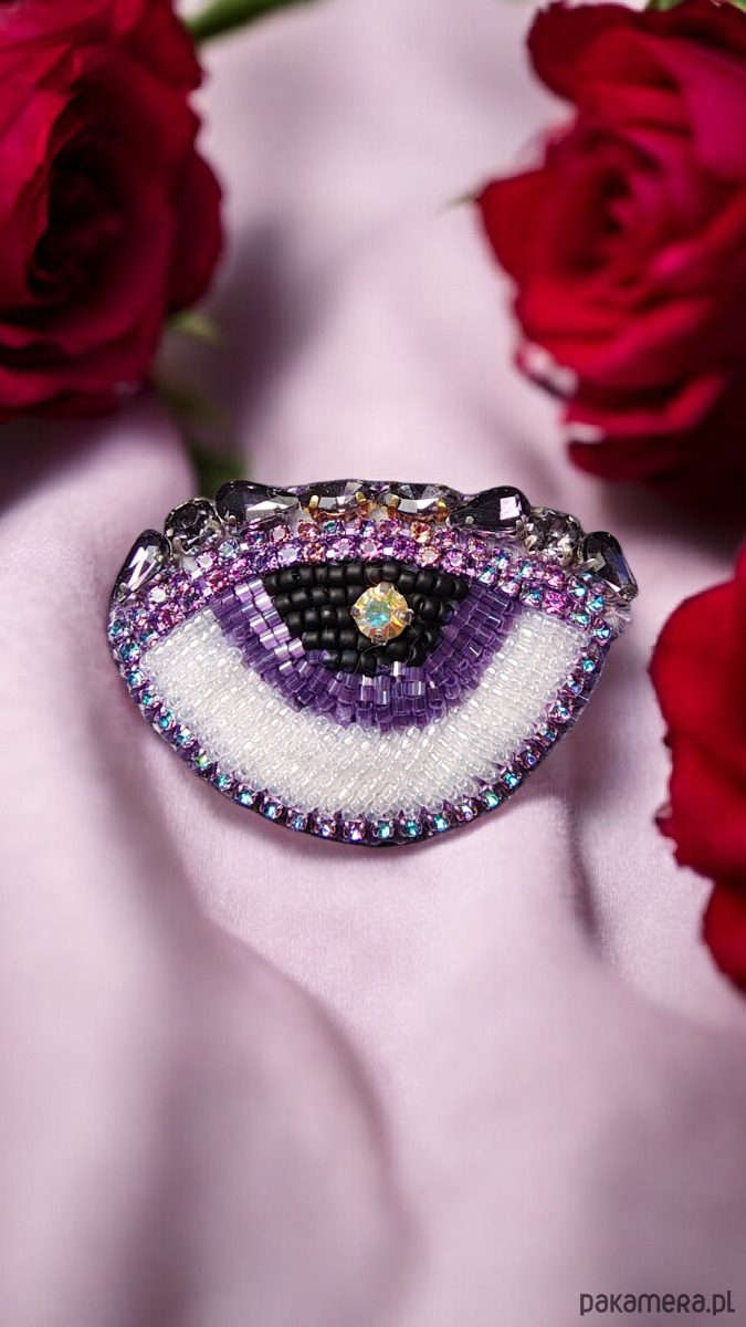 Zjawiskowa broszka z motywem oka w sercu. Wykonana z kilku rodzajów koralików oraz kryształków.