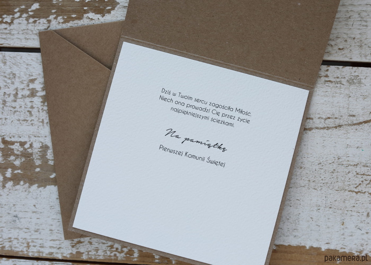 Kartka o wymiarach 14x14 cm wykonana jest z papieru kraftowego oraz papieru bawełnianego w kolorze śmietanki z użyciem ozdoby tekturkowej. Kartka otwierana do góry, w środku wklejona jest kartka z papieru bawełnianego z gotowymi życzeniami (brak możliwości zmiany). W zestawie z kopertą.