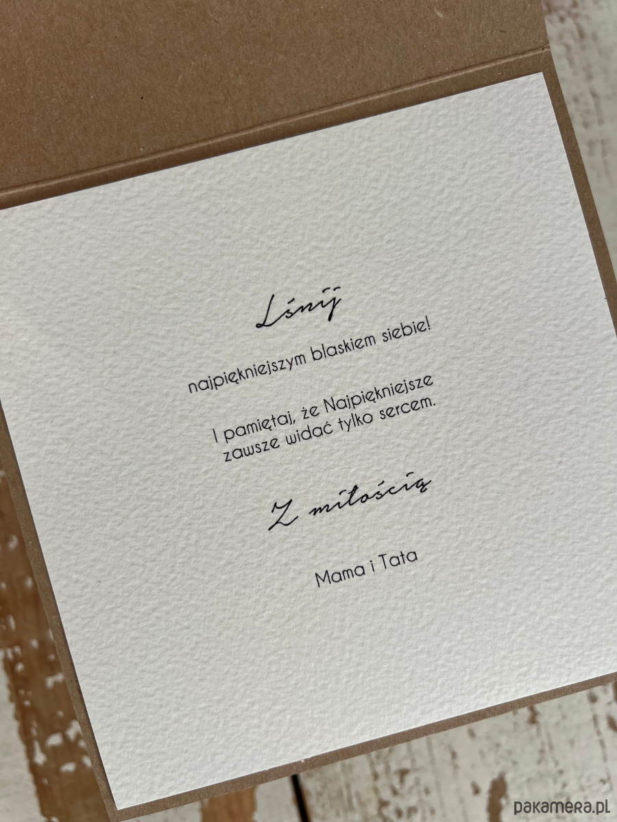 Kartka na chrzest o wymiarach 14x14 cm wykonana jest z papieru kraftowego oraz papieru bawełnianego w kolorze śmietanki z użyciem ozdoby tekturkowej. Kartka otwierana do góry, w środku wklejona jest kartka z papieru bawełnianego z gotowymi życzeniami. W zestawie z kopertą.