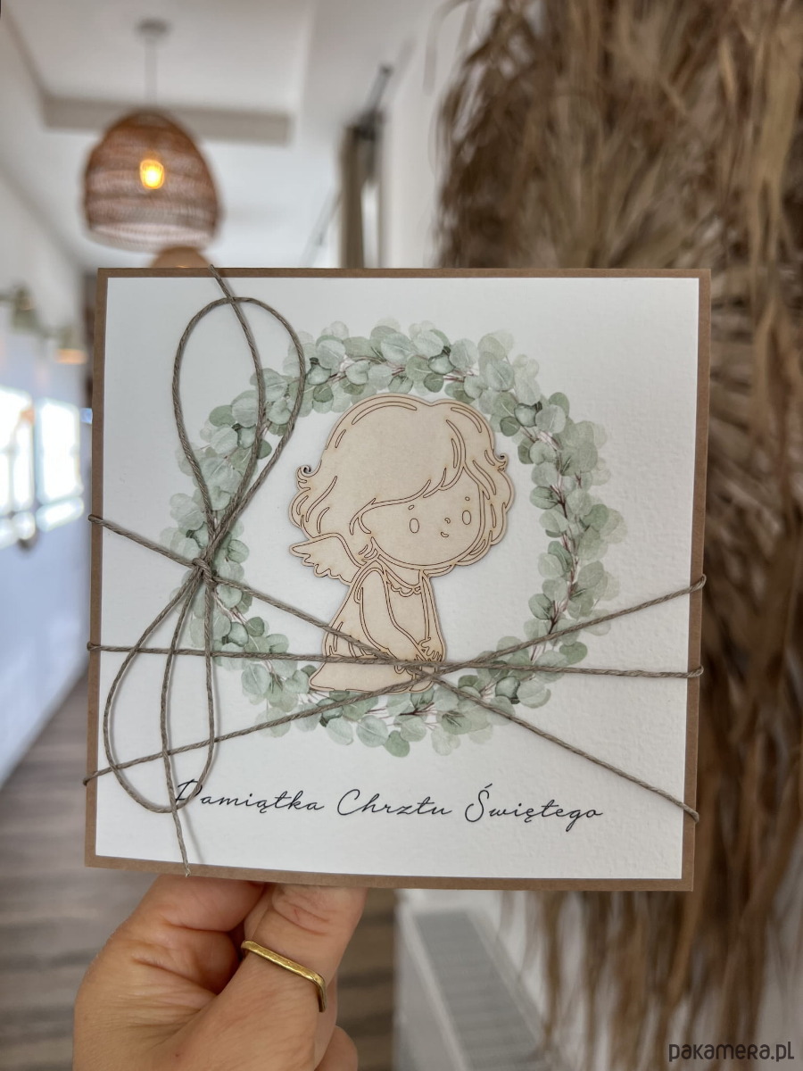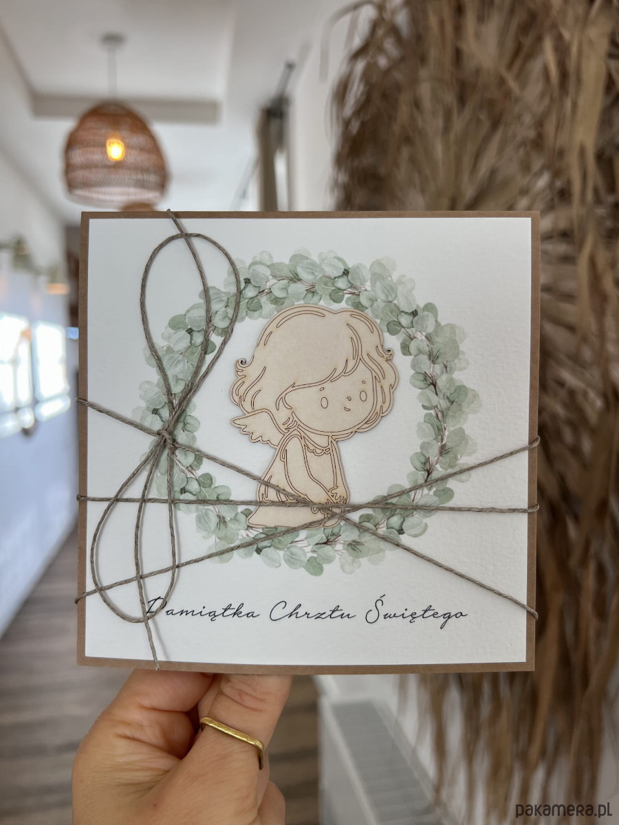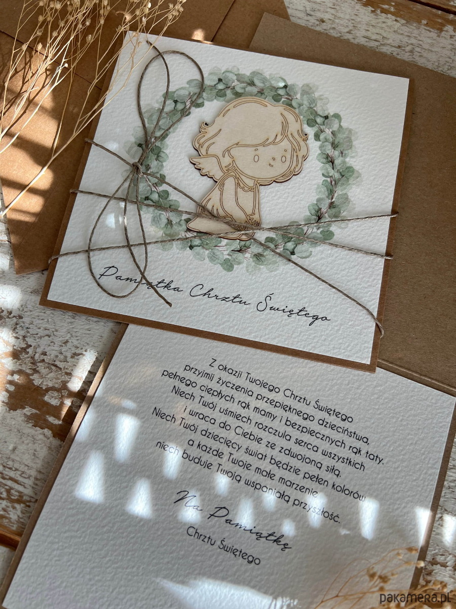 Kartka na chrzest o wymiarach 14x14 cm wykonana jest z papieru kraftowego oraz papieru bawełnianego w kolorze śmietanki z użyciem ozdoby tekturkowej. Kartka otwierana do góry, w środku wklejona jest kartka z papieru bawełnianego z gotowymi życzeniami (brak możliwości zmiany). W zestawie z kopertą.