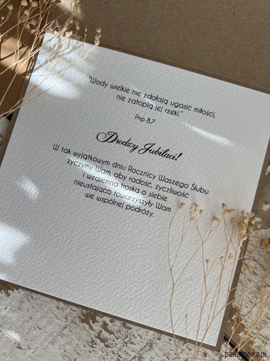 Wymiary: kartka 14x14cm otwierana do góry, przewiązana lnianym sznureczkiem w zestawie z kopertą.