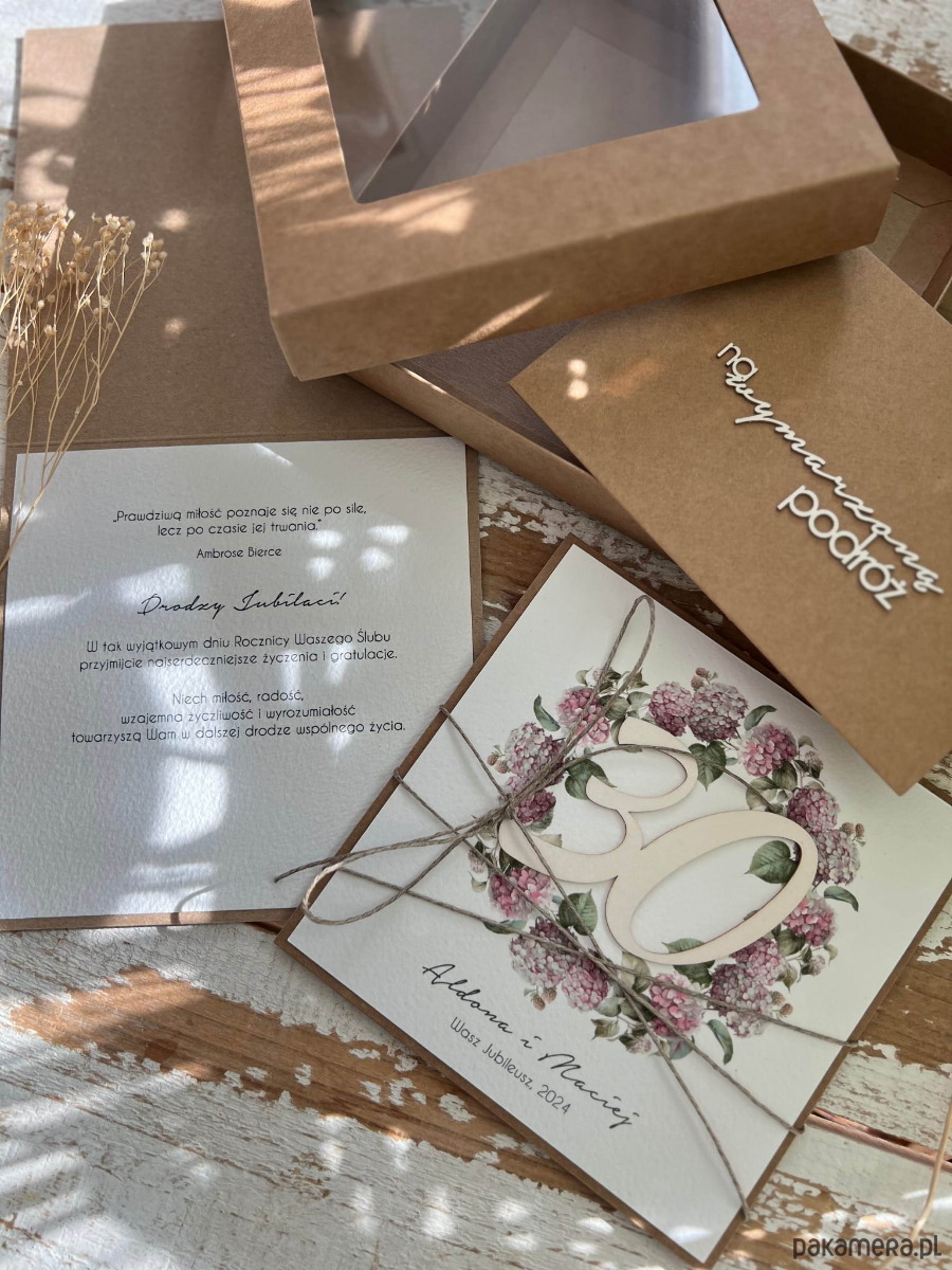 Kartka wykonana jest z najwyższej jakości starannie dobranych materiałów i dodatków w tym papieru kraftowego, ekologicznego papieru bawełnianego - 100% bawełny w odcieniu śmietanki, tekturtkowych ozdób. Personalizowana na przodzie w postaci imion, daty rocznicy, życzeń.