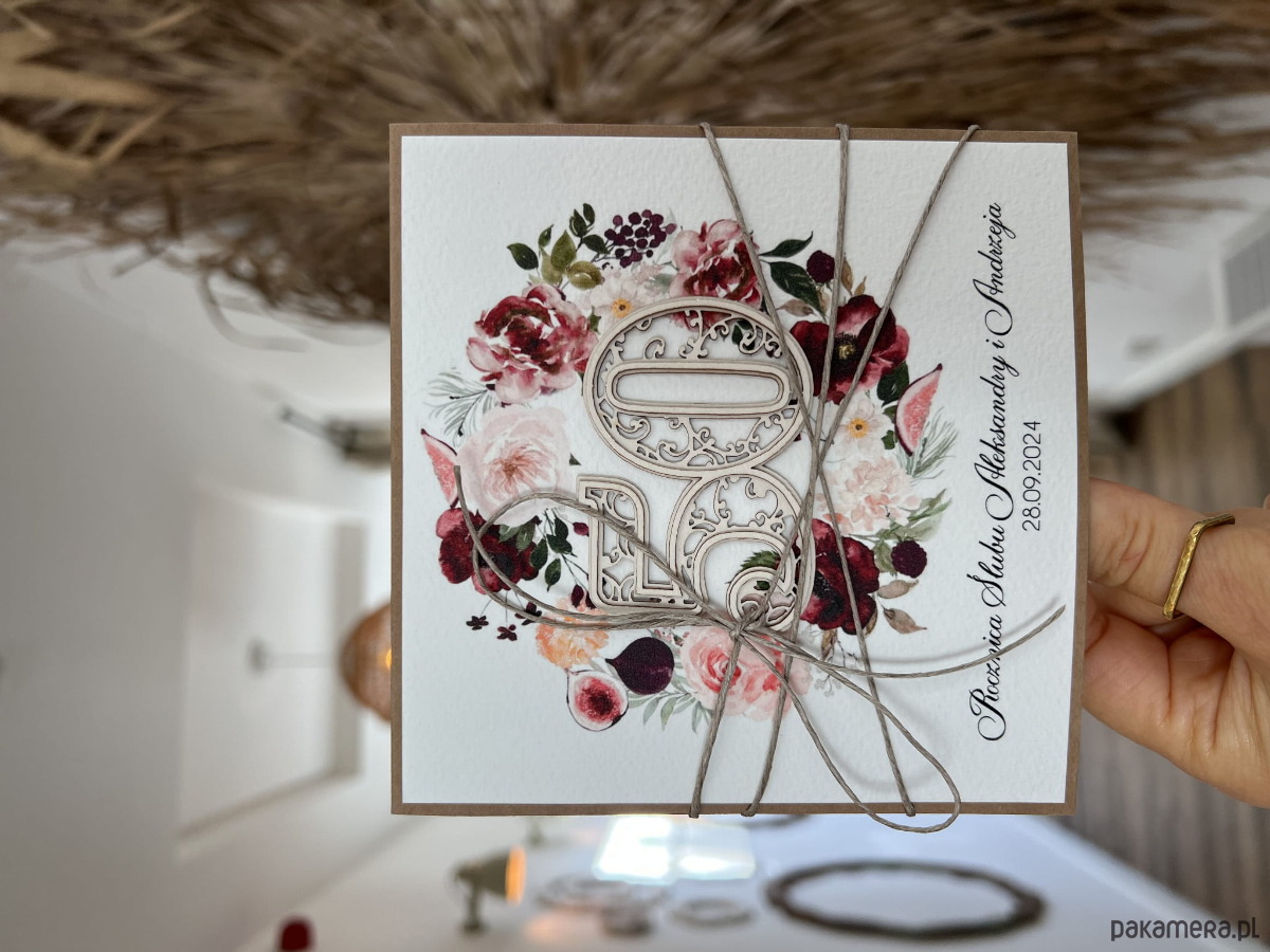 Wymiary: kartka 14x14cm otwierana do góry, przewiązana lnianym sznureczkiem w zestawie z kopertą.
