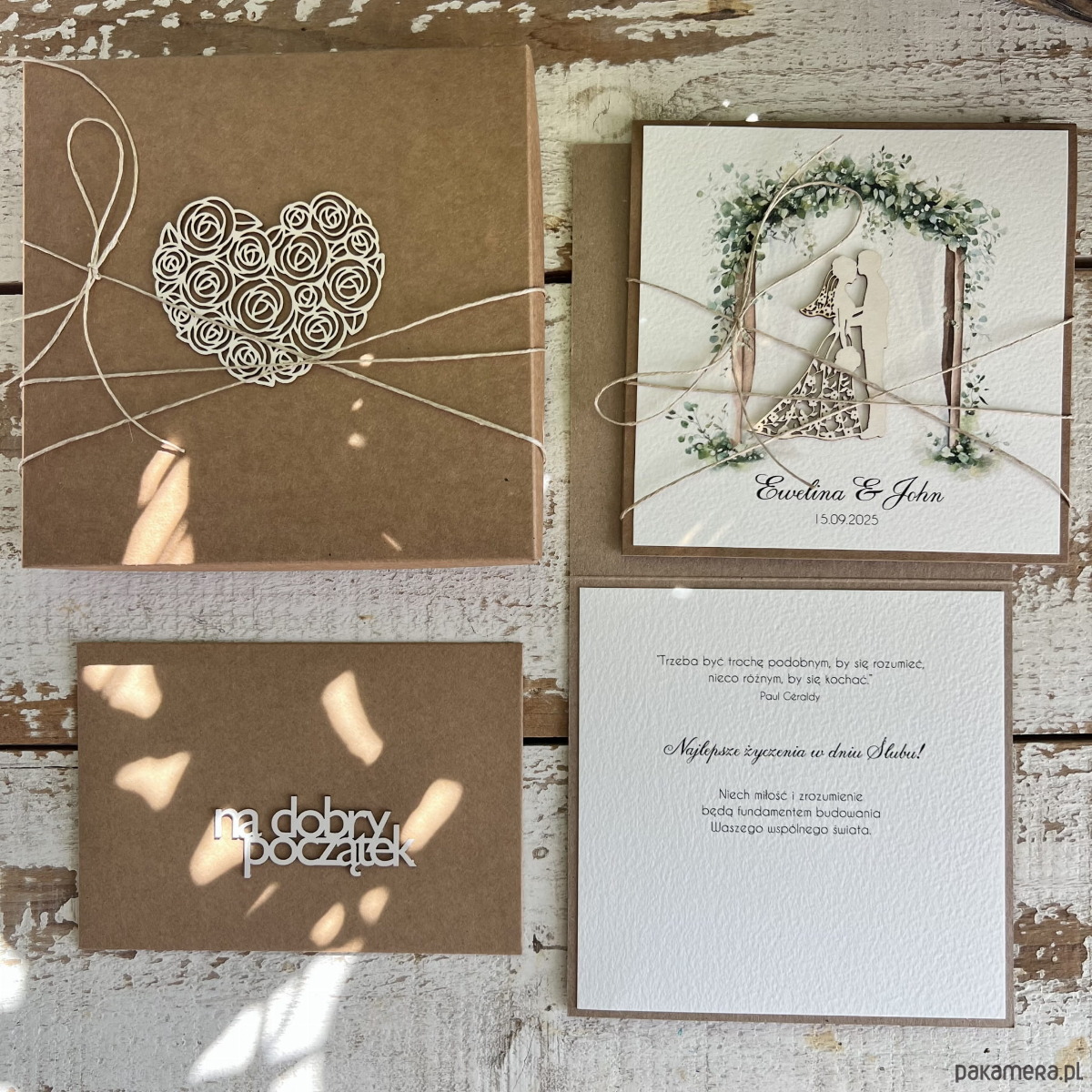 Rustykalna kartka ślubna ręcznie robiona z personalizacją na ślub z życzeniami