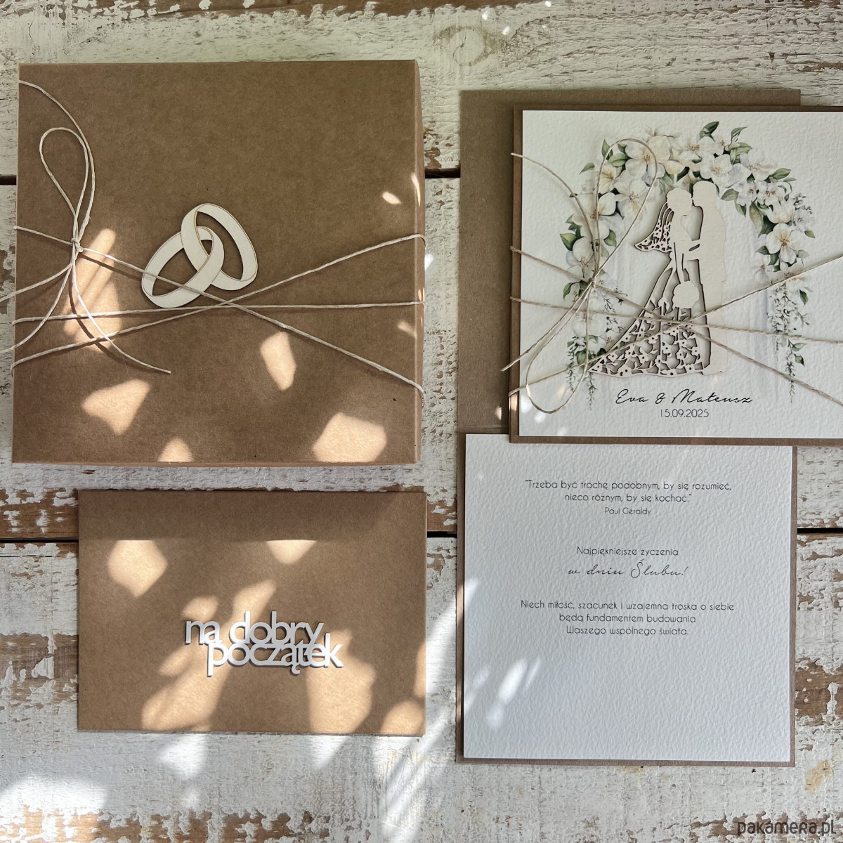 Rustykalna kartka ślubna ręcznie robiona z personalizacją na ślub z życzeniami