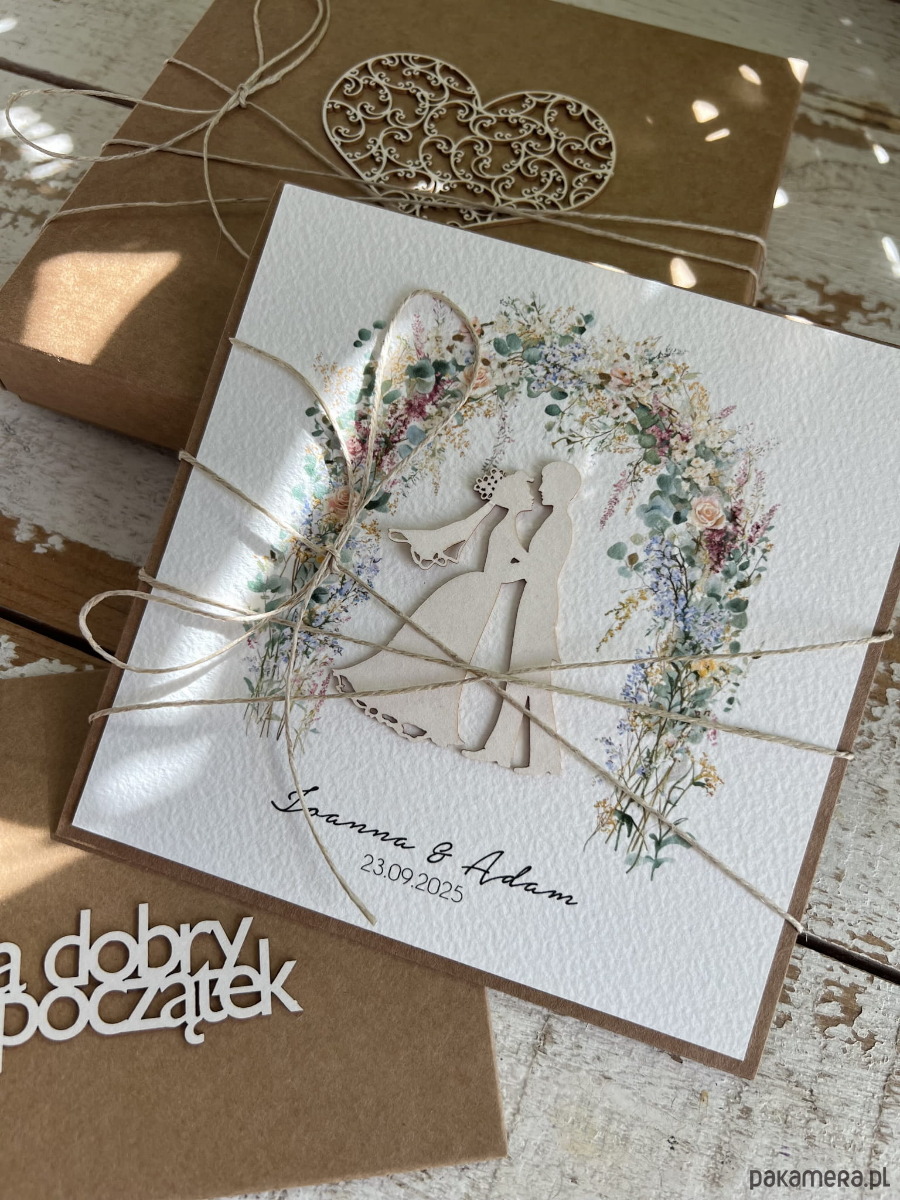 Rustykalna kartka ślubna ręcznie robiona z personalizacją na ślub z życzeniami