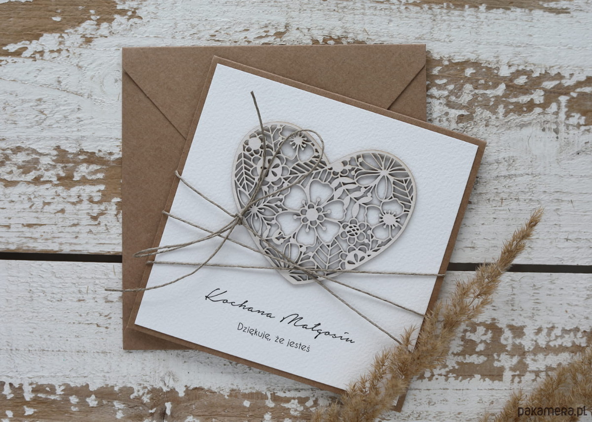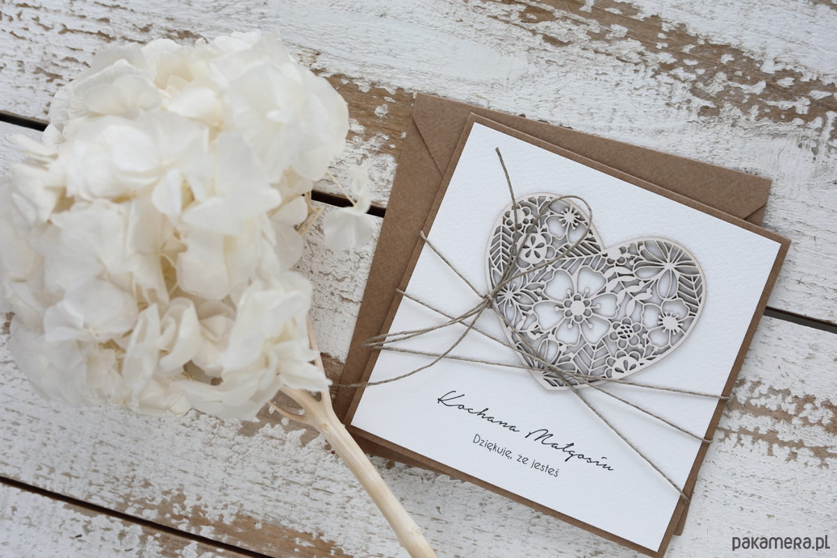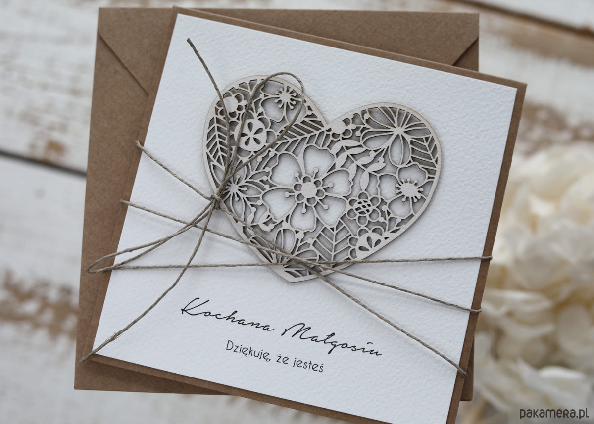 Kartka wykonana z papieru kraftowego oraz bawełnianego 100% z dodatkiem ślicznego tekturkowego serca.