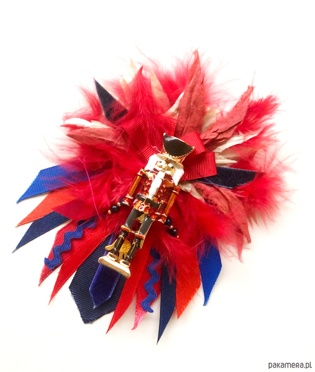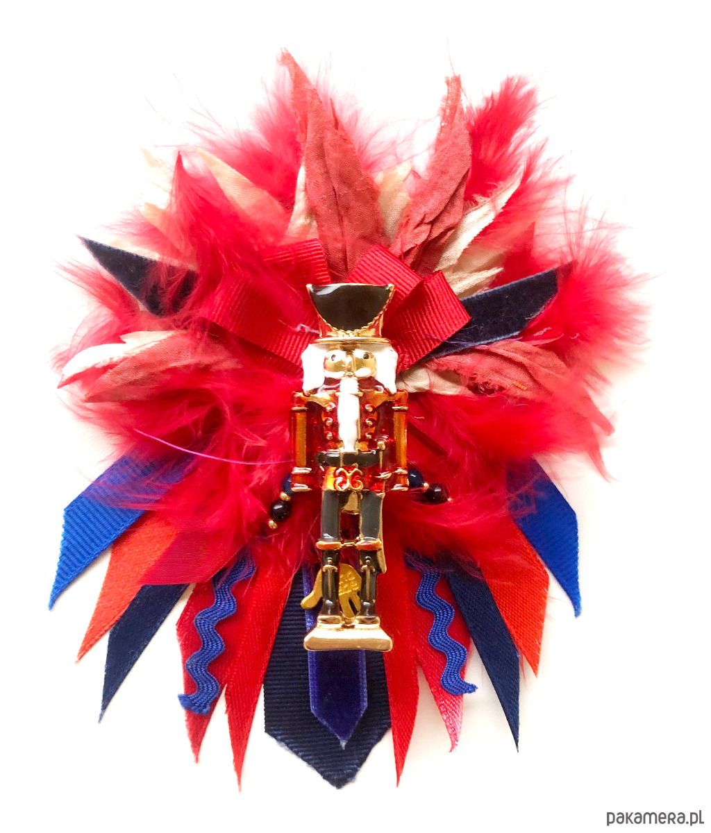 Wyjątkowa broszka stworzona z różnych materiałów: tasiemek, piór, koralików w odcieniach czerwieni, błękitu, żółtego i fioletu z dziadkiem do orzechów w środku. Długość 13 cm, szerokość 8 cm. Idealna do kurtek. marynarek czy płaszczy.