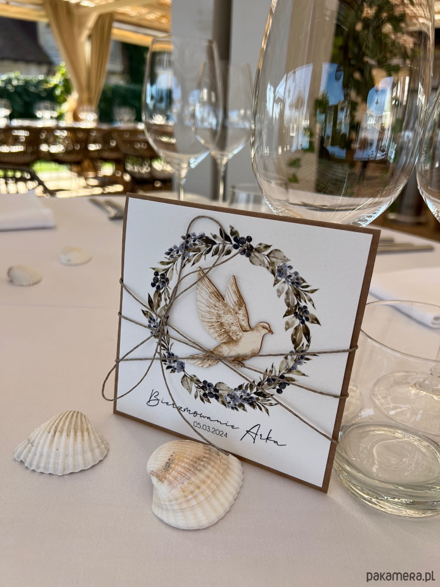 Wymiary: kartka 14x14cm otwierana do góry, przewiązana lnianym sznureczkiem w zestawie z brązową kopertą.