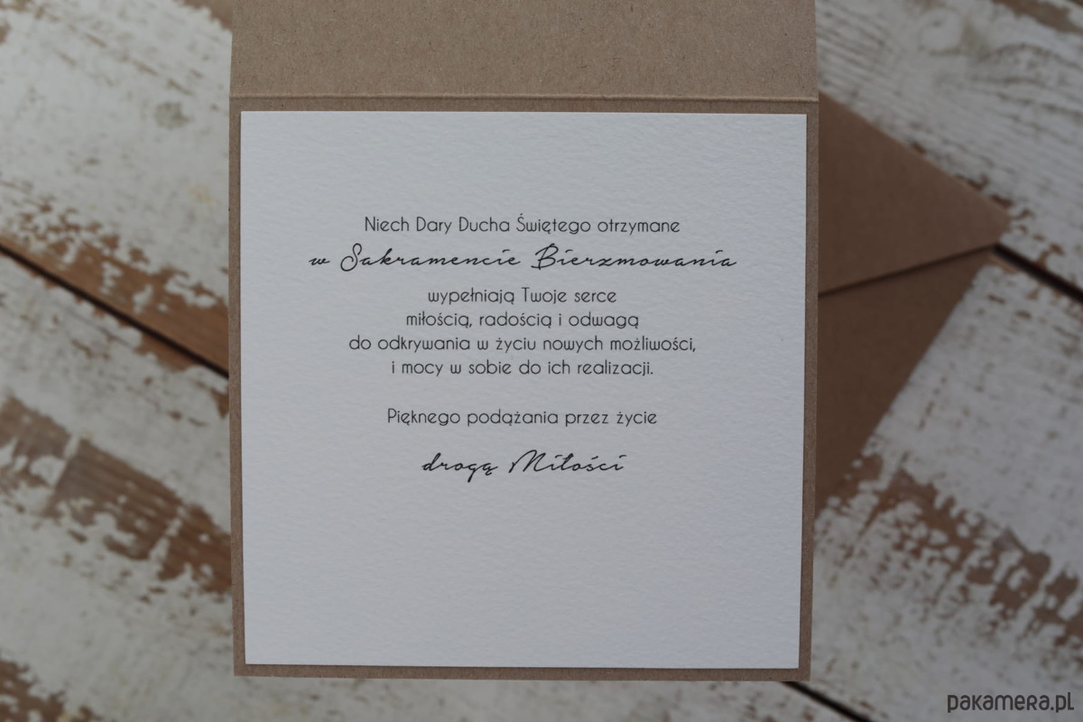 Kartka wykonana jest z najwyższej jakości starannie dobranych materiałów i dodatków w tym papieru kraftowego, ekologicznego papieru bawełnianego - 100% bawełny w odcieniu śmietanki, tekturtkowych ozdób. Personalizowana na przodzie w postaci imienia, daty bierzmowania, życzeń.