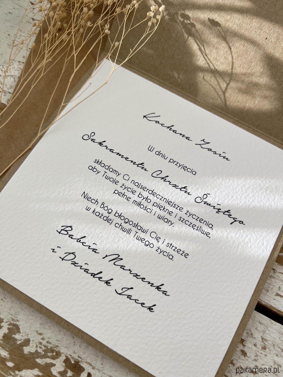 Rustykalna kartka na chrzest handmade wykonana na bazie papieru kraftowego z użyciem starannie wyselekcjonowanego papieru bawełnianego w kolorze ecri oraz tekturkowej ozdoby. Kartka otwierana jest do góry. Kartka przewiązana jest lnianym sznureczkiem.