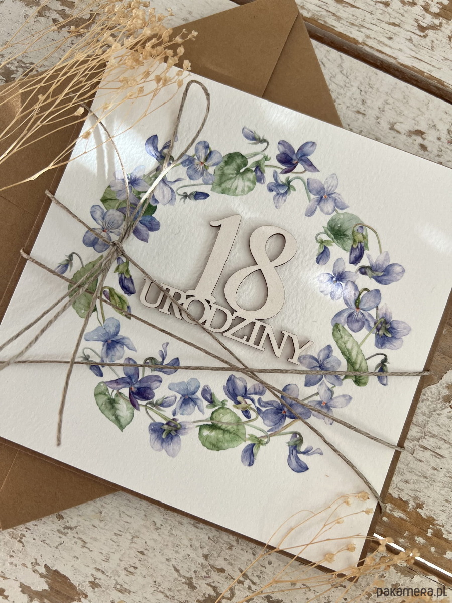 Wyjątkowa ręcznie robiona kartka na 18-ste urodziny, osiemnastka, pomysł na prezent na osiemnastkę dla córki, dziewczyny prezent od rodziców - fiołki