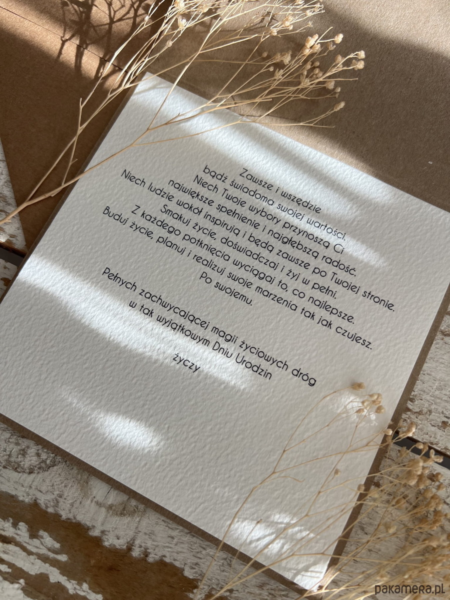W środku wklejona jest jedna kartka z papieru bawełnianego z życzeniami widocznymi na zdjęciu. Zestaw zawiera kartkę oraz kopertę.
